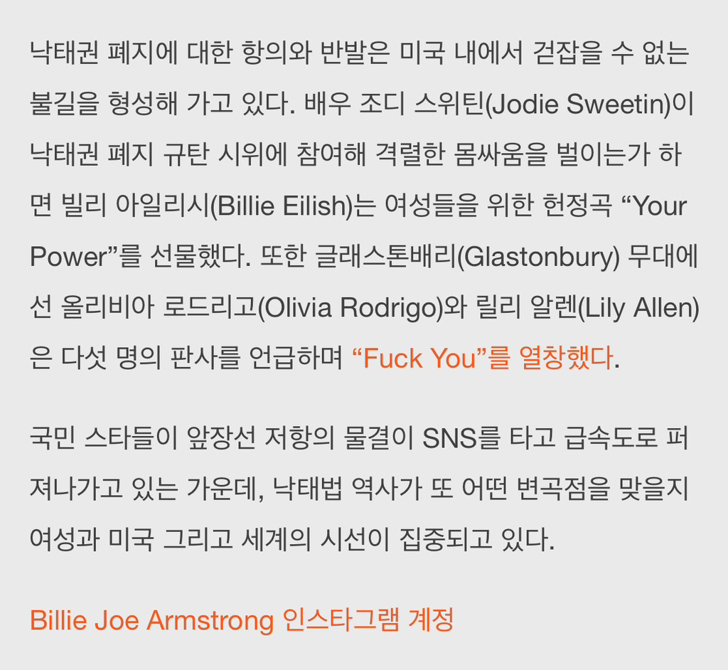 근데 2년전이긴 하지만 미국 낙태권 폐지에 대해 강하게 목소리를 냄