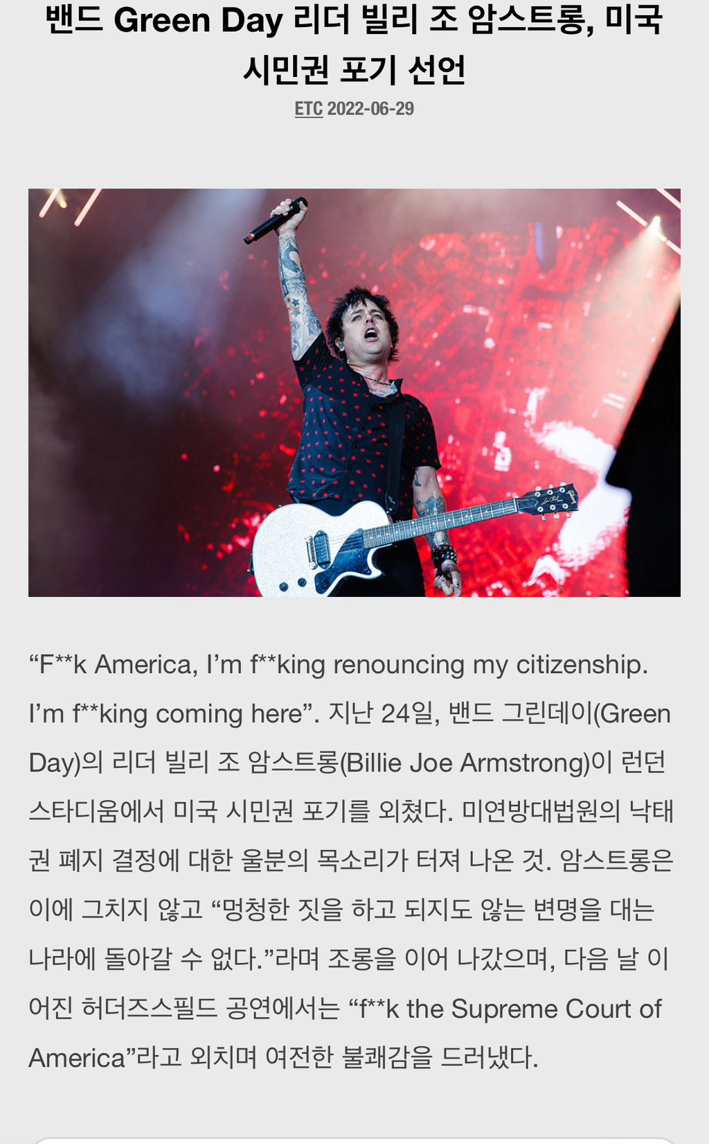 [스크랩] [흥미돋][그린데이] 락스피릿 쩌는 미국시민권 포기 선언한 그린데이 빌리조 (낙태권 폐지때문에)