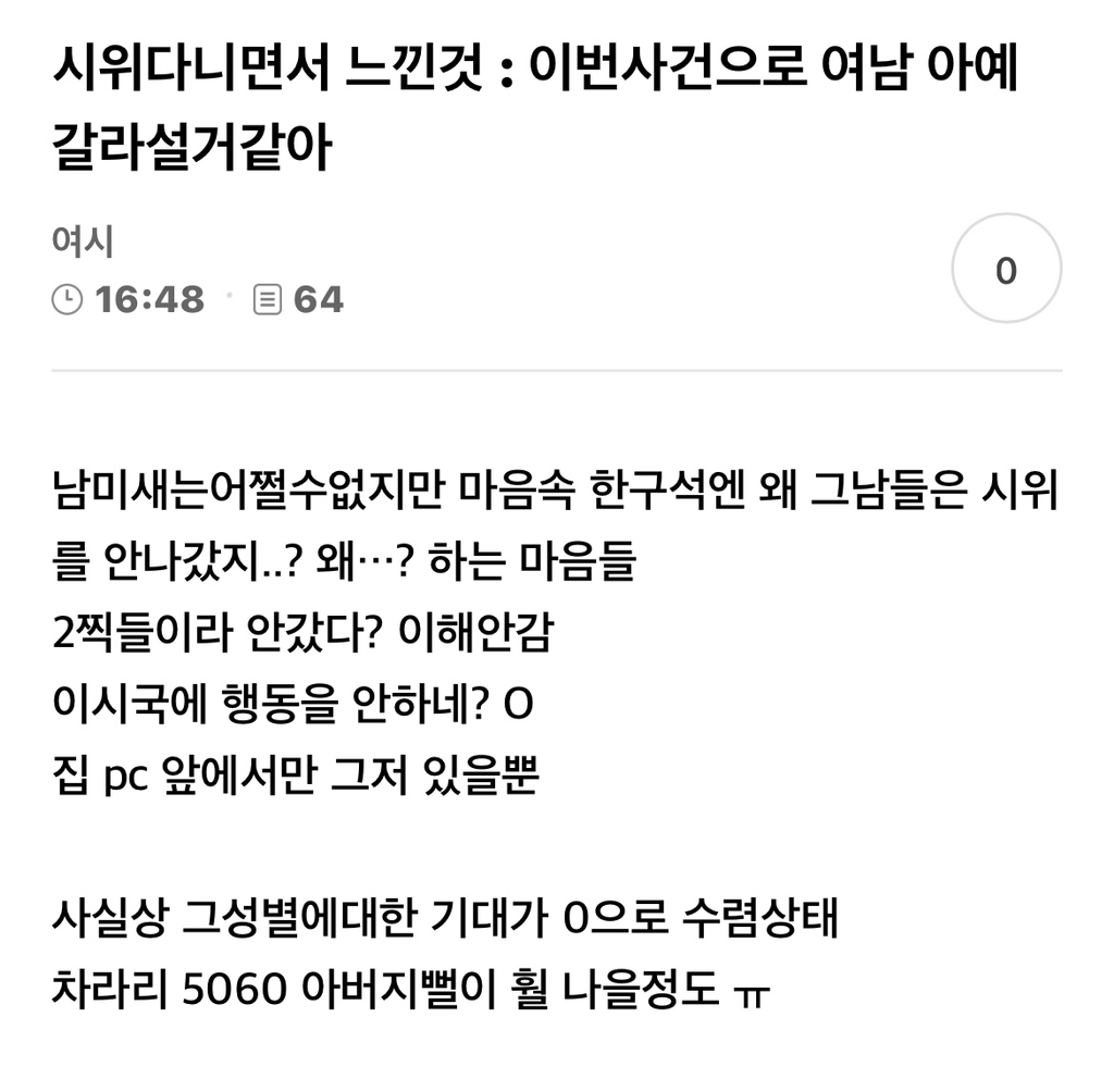 작성자españa 작성시간 24.12.14 ㄹㅇ이야 여자들은 여의도가서 시위하는데 어제 학원이 강남이라 집에가는데 길거리 챙놈 한남등만 디글디글하더라 시발 ... 존나 암담한 2030 냄져들🤮