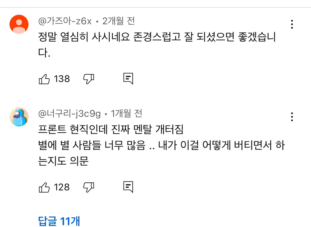 맨날 그러는게 아니고 한번씩 정도가 심할때 현타 개오지게옴 신입시절엔 일주일에 5일은 울고살았던것같음 -
