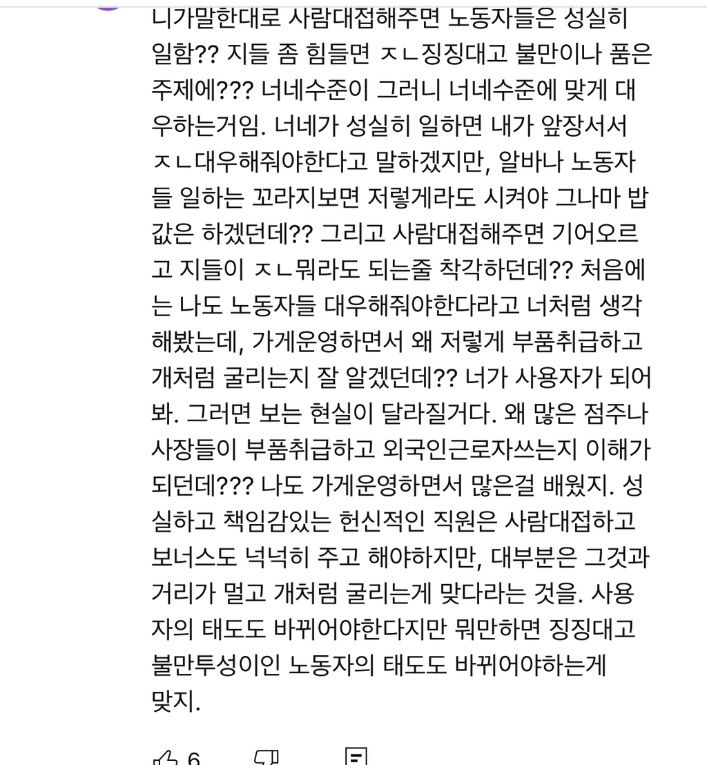 작성자귤양갱 작성시간 24.12.14 진짜 구두때문에 발 모양 다바뀌고 일하면서 온갖 병은 다 얻고 그러는데 그중에서 젤 힘든게 진상들 웃으면서 다 받아줘야하는게 제일 좆같음 분명 손님새끼가 떼쓰고우기는건데 우리가 굽신굽신해야한다는게 ㅋㅋ ㅠ 물론 제3자가봤을때 그럼 서비스직 왜하냐 니가 선택한거잖아 라고하면 할말은없지...