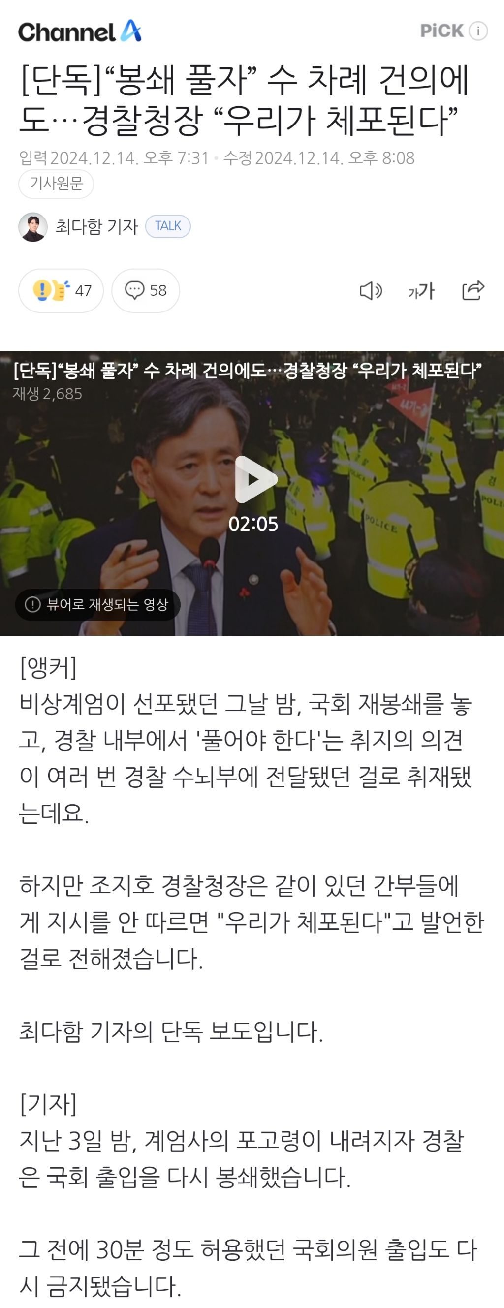 [여시뉴스데스크][단독]“봉쇄 풀자” 수 차례 건의에도…경찰청장 “우리가 체포된다” 작성자천리길|작성시간24.12.15|조회수3,082 목록 댓글 8 글자크기 작게가 글자크기 크게가 출처: https://naver.me/FnmCNLH0[단독]“봉쇄 풀자” 수 차례 건의에도…경찰청장 “우리가 체포된다”비상계엄이 선포됐던 그날 밤, 국회 재봉쇄를 놓고, 경찰 내부에서 '풀어야 한다'는 취지의 의견이 여러 번 경찰 수뇌부에 전달됐던 걸로 취재됐는데요. 하지만 조지호 경찰청장은 같이 있던 간n.news.naver.com이하 생략전문 출처로 다음검색 현재 게시글 추가 기능 열기 북마크 공유하기 신고 센터로 신고 댓글 댓글 8 댓글쓰기 답글쓰기 댓글 리스트 작성자알파벳입력 | 작성시간 24.12.15 ㄹㅈㄷ 작성자윤석열아어서빨리박정희의뒤를따라가 | 작성시간 24.12.15 ㅇㅇ 결국 쇠고랑은 니 손목에 작성자패딩턴 | 작성시간 24.12.15 말하는대로~~~•• 작성자조쉬 코헨 | 작성시간 24.12.15 조지호 깜빵 비워놨다고 작성자뚱바뚱바 | 작성시간 24.12.15 혼자 못 죽겠다는건가 댓글 전체보기