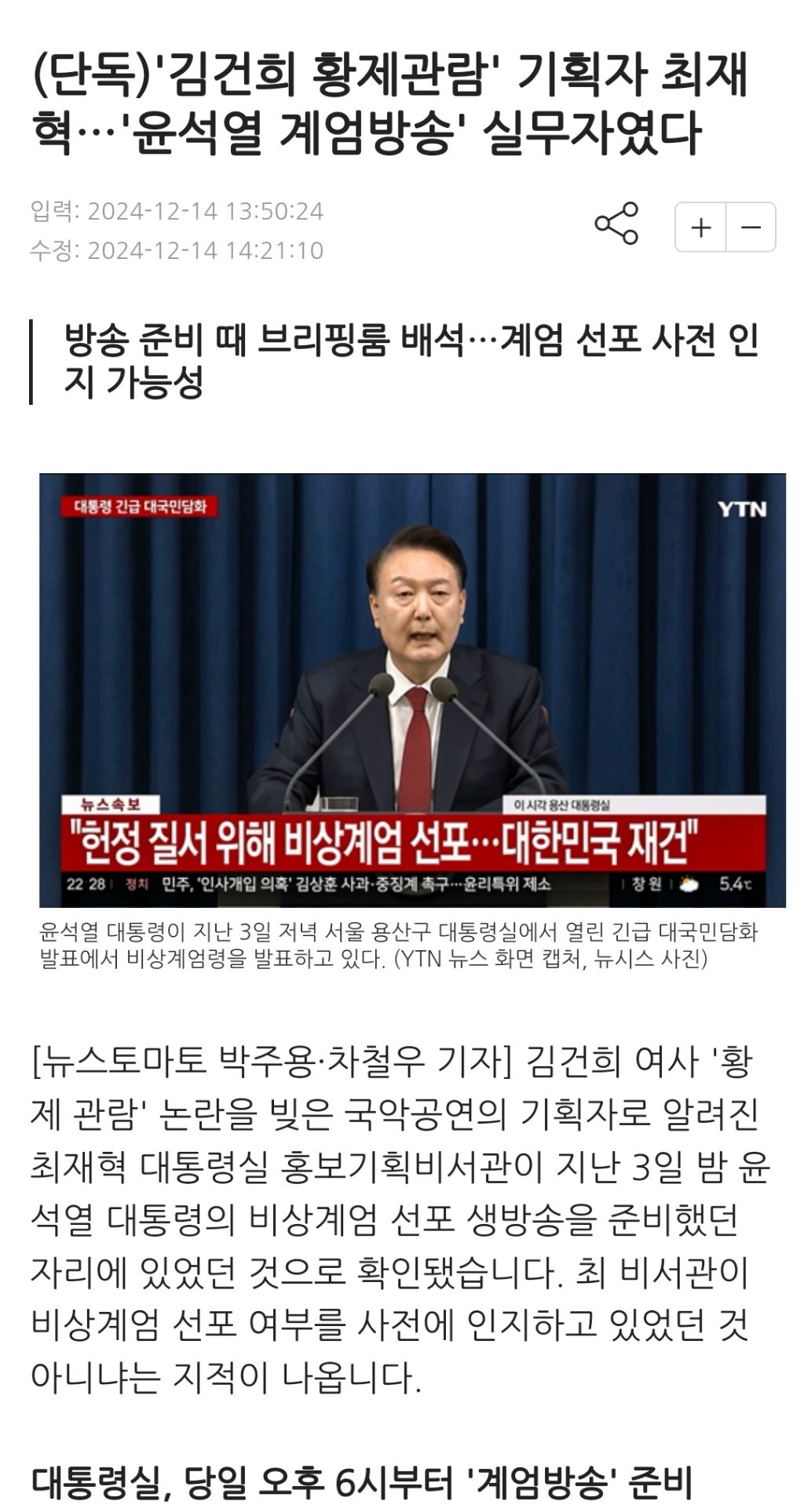 [여시뉴스데스크]'김건희 황제관람' 기획자 최재혁…'윤석열 계엄방송' 실무자였다 작성자천리길|작성시간24.12.15|조회수3,315 목록 댓글 4 글자크기 작게가 글자크기 크게가 출처: https://www.newstomato.com/ReadNews.aspx?no=1248098&inflow=N(단독)'김건희 황제관람' 기획자 최재혁…'윤석열 계엄방송' 실무자였다방송 준비 때 브리핑룸 배석…계엄 선포 사전 인지 가능성www.newstomato.com중략이하 생략전문 출처로 다음검색 현재 게시글 추가 기능 열기 북마크 공유하기 신고 센터로 신고 댓글 댓글 4 댓글쓰기 답글쓰기 댓글 리스트 작성자NC Dinos | 작성시간 24.12.15 에휴 작성자조쉬 코헨 | 작성시간 24.12.15 진짜 얘들은 그냥이 없구나 작성자먹고 눕지말래서 누워서먹어요 | 작성시간 24.12.15 내란 가담자들 다 사형때려 작성자무도전한 | 작성시간 24.12.15 내란가담자네? 잡아다가 수사해 댓글 전체보기