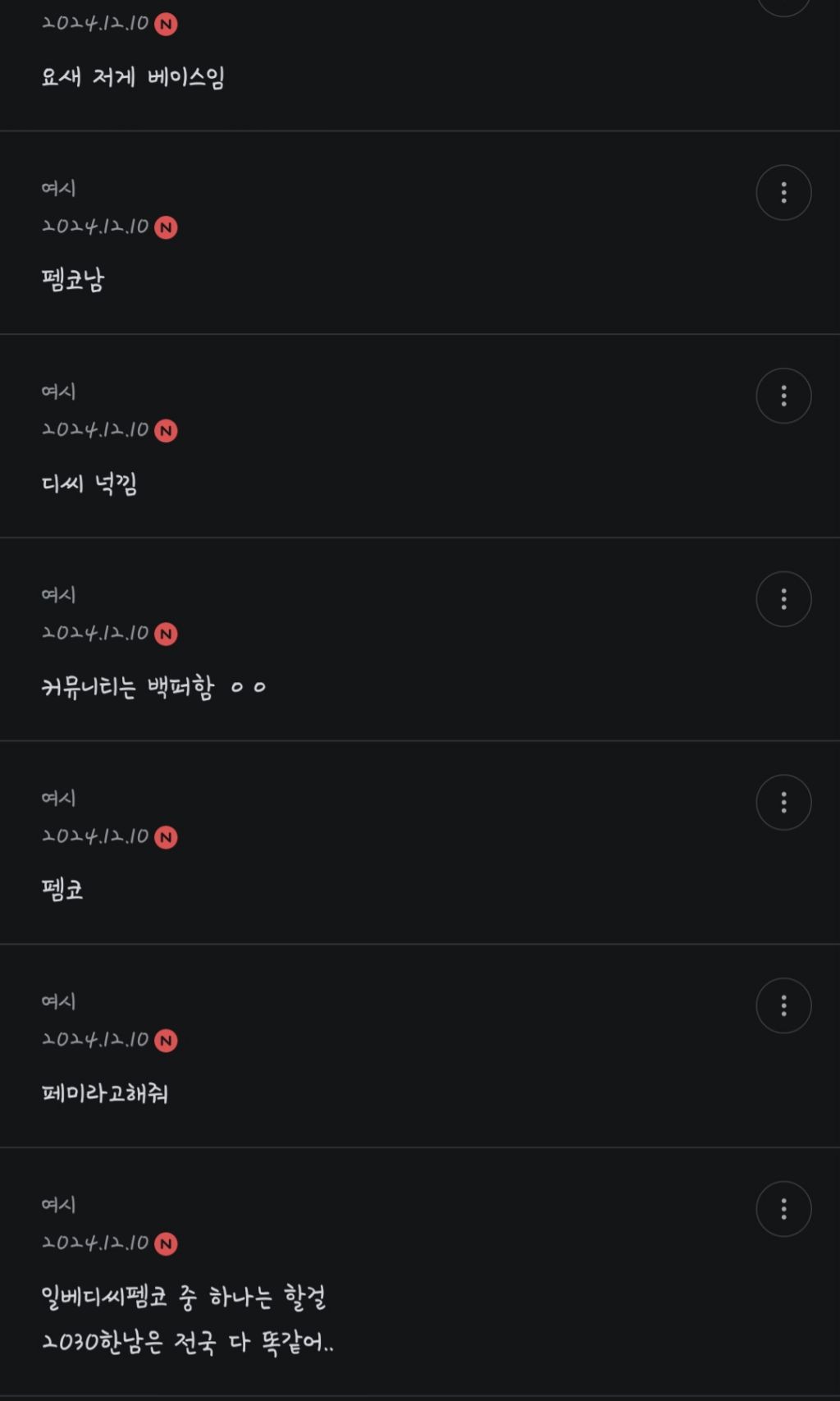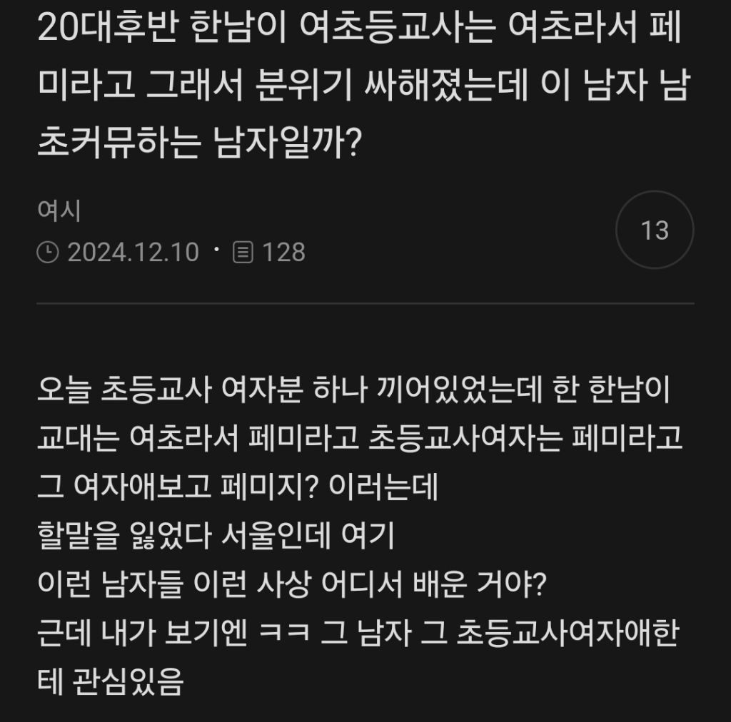 작성자미뉘핑 작성시간 24.12.16 ㅇㅇ찐임 대학동기들 전에 만났을때 아~ 와이프로 페미는 안되지 ㅇㅈㄹ 너무 어이없어서 할말을 잃음