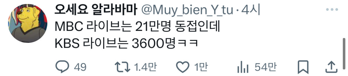 [스크랩] [흥미돋]MBC 21만명 KBS 3600명 작성자Tory-|작성시간24.12.16|조회수6,980 목록 댓글 19 글자크기 작게가 글자크기 크게가 출처: 여성시대 모두한마음으로탄핵https://x.com/muy_bien_y_tu/status/1867827590939259322?s=46앞으로도 계속!!MBC 밀어 주자 여시덜 다음검색 스크랩 원문 : *여성시대* 차분한 20대들의 알흠다운 공간 현재 게시글 추가 기능 열기 북마크 공유하기 신고 센터로 신고 댓글 댓글 19 댓글쓰기 답글쓰기 댓글 리스트 작성자바람이불다 | 작성시간 24.12.16 엠비씨야 계속 잘하자 작성자Gummibear | 작성시간 24.12.16 kbs가 뭐더라 작성자금속노조는 선봉에 선다 | 작성시간 24.12.16 엠비씨야 이재명 지우지말고 똑바른 길 같이가자 작성자감자돌이2 | 작성시간 24.12.16 케백수를 누가봐 진짜 신뢰도0 작성자쫀-득! | 작성시간 24.12.16 요즘 누가 kbs보냐~ 댓글 전체보기