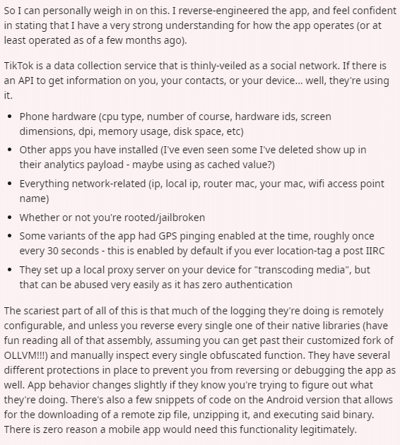 한번 틱톡을 깔아 쓴 사람이면 간접적으로 추적이 가능한 정보를 중국에 넘겨준다는 얘기