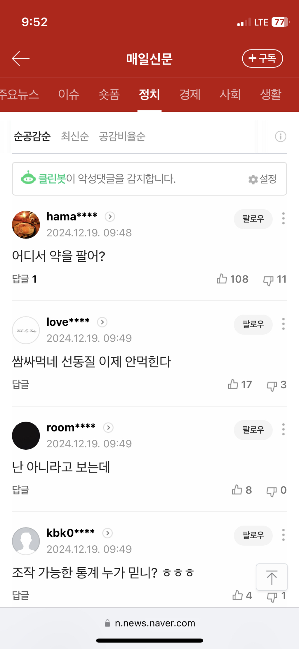 [여시뉴스데스크][속보] 국민 과반 "민주당이 여당 역할 가능…국민의힘, 여당 아냐" 작성자감바사리|작성시간24.12.19|조회수2,445 목록 댓글 48 글자크기 작게가 글자크기 크게가 출처: https://naver.me/502KgqBa[속보] 국민 과반 "민주당이 여당 역할 가능…국민의힘, 여당 아냐"탄핵소추안 가결로 윤석열 대통령의 직무가 정지된 상황에서 국민의 절반 이상이 국민의힘을 여당으로 인정하기 어렵다는 여론조사 결과가 나왔다. 19일 여론조사 전문업체 리얼미터가 에너지n.news.naver.com댓글엔 찐따들 가득하지만 찐따들 이기기 참 쉽죠?댓글부대 즐일은 민주당이 여당처럼 하고있음말이 되냐?문제시 삭제 다음검색 현재 게시글 추가 기능 열기 북마크 공유하기 신고 센터로 신고 댓글 댓글 48 댓글쓰기 답글쓰기 댓글 리스트 작성자롬앤앤 | 작성시간 24.12.19 댓완 작성자왜이리덥냐 | 작성시간 24.12.19 국짐은 걍 매국노당임 작성자행복한햇감자 | 작성시간 24.12.19 완 작성자희희떡볶이 | 작성시간 24.12.19 완 작성자승객여러분 | 작성시간 24.12.19 완 댓글 전체보기