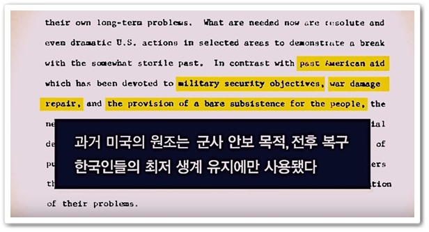 과거 미국의 원조는 군사안보 목적, 전후 복구, 한국인들의 최저 생계유지에만 사용됐다. 그런 뼈아픈 반성을 한 뒤 앞으로는 미국의 원조를 한국의 경제개발에 집중 투자한다. 케네디의 전략가들은 치밀한 사람들이었다.