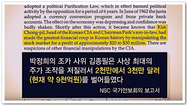 1962년 5월... 증권시장이 파탄이 났다. 박정희 집권을 위해 그의 조카사위 김종필의 부하들이 정치자금을 마련하려고 사상 최대의 주식 사기를 친 것이다. 박정희의 조카사위 김종필은 사상 최대의 주가 조작을 저질러서 2천만에서 3천만 달러(현재 약 9천억 원)를 벌어들였다. <Memorandum From NSC To Kennedy>