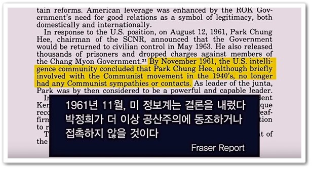 1961년 11월... 미 정보계는 결론을 내렸다. 박정희가 더 이상 공산주의에 동조하거나 접촉하지 않을 것이다. <프레이저 보고서> 그리고 1961년 11월 11일... 박정희는 일본과 미국의 권력자들을 만나러 떠났다.