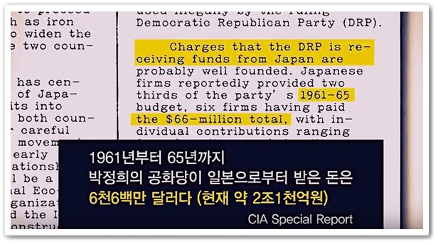 1961년부터 1965년까지 박정희의 공화당이 일본으로부터 받은 돈은 6천6백만 달러(현재 약 2조 1천억 원)다. <CIA Special Report> 이제 한국은 대일 무역적자의 수렁 속으로 빠지게 된 것이다.