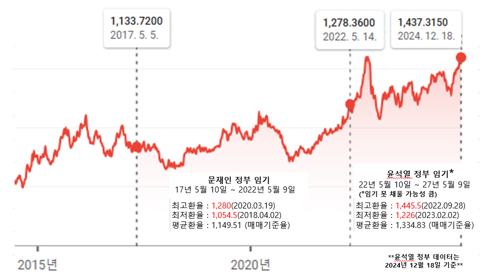 그래프는 구글금융에서 가져온 그래프로, 막대기 표시는 실제 각 정부 임기 시작/완료 일자 최대한 가까운 날짜로 캡쳐. 최고,최저,평균 환율은 우리은행 환율조회 페이지에서 각 정부 임기 시작/완료 일자를 넣음.
