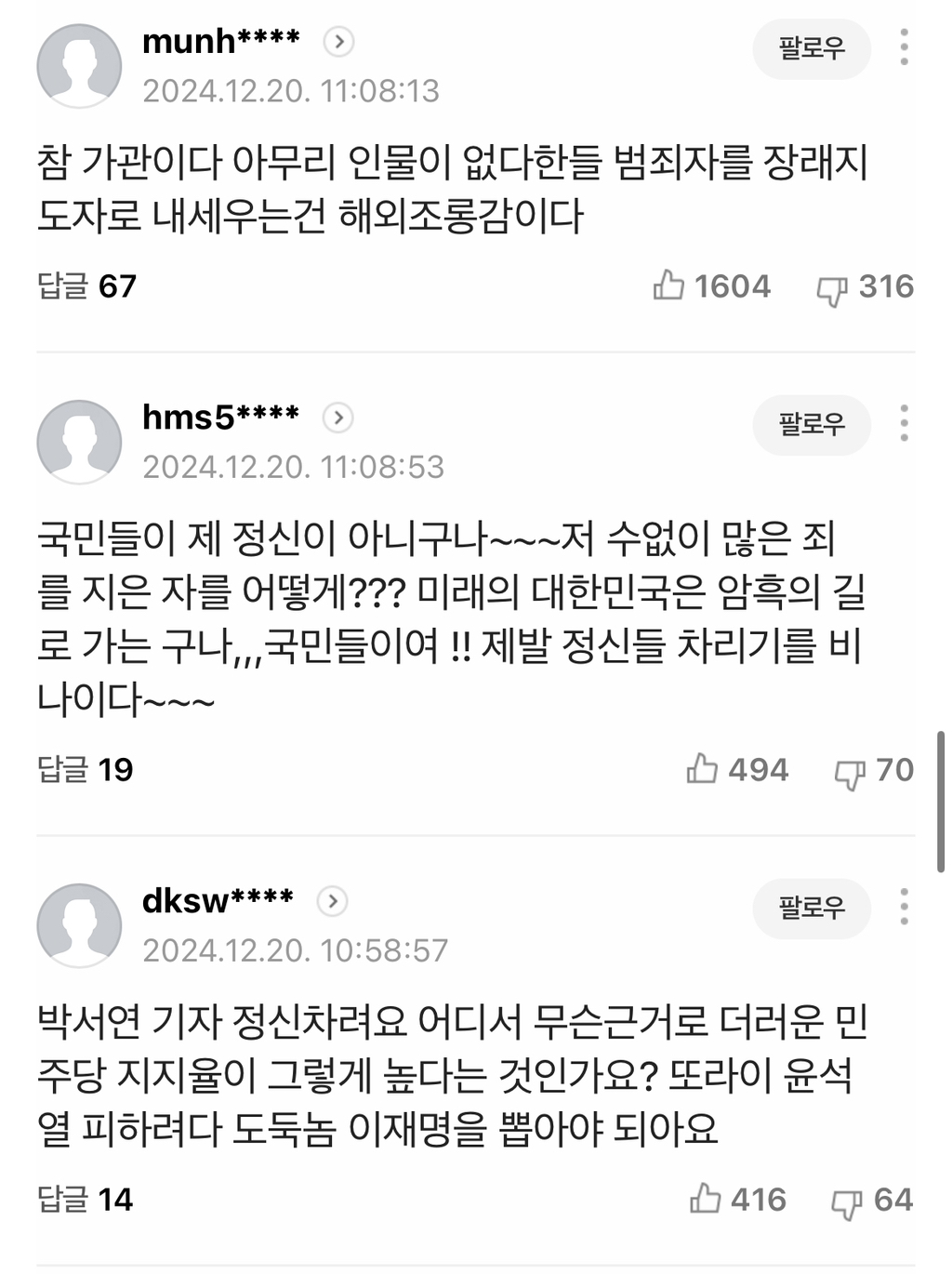 [여시뉴스데스크]尹정부 들어 민주당 역대 최고 48% 지지율…장래 지도자 1위 이재명 -> 2찍 갈배 댓글 엄청 많아 도와줘😭🚨🚨🚨 작성자ㅇㅇ엉어이|작성시간24.12.20|조회수1,126 목록 댓글 68 글자크기 작게가 글자크기 크게가 출처: https://naver.me/5Bcjd22j尹정부 들어 민주당 역대 최고 48% 지지율…장래 지도자 1위 이재명윤석열 정부 출범 이후 더불어민주당이 역대 최고 지지율 48%를 기록했다. 장래 정치 지도자 1위에는 이재명 민주당 대표가 37%를 기록해 1위에 올랐다. 앞서 지난 13일에도 민주당은 현 정부 출범 n.news.naver.com이하 생략전문 출처로도와줘 여시들 다음검색 현재 게시글 추가 기능 열기 북마크 공유하기 신고 센터로 신고 댓글 댓글 68 댓글쓰기 답글쓰기 댓글 리스트 작성자자나깨나당뇨조심 | 작성시간 24.12.20 완 작성자토리츠카레 | 작성시간 24.12.20 완 작성자가보자고오옹 | 작성시간 24.12.20 완 작성자스땁플리즈스땁플리즈 | 작성시간 24.12.20 완 작성자고습도치의 습겪 | 작성시간 24.12.21 완 댓글 전체보기