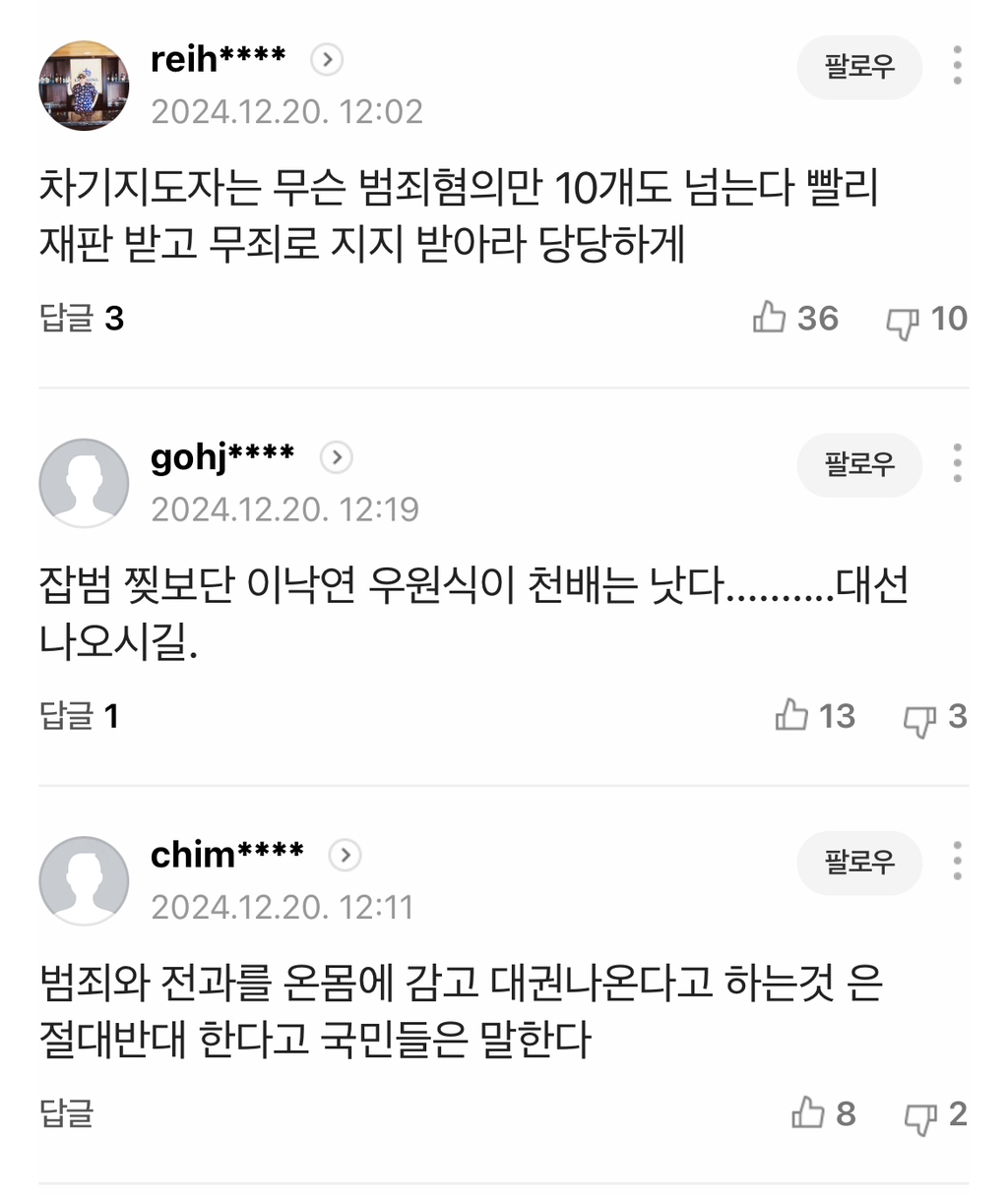 [여시뉴스데스크]민주당 지지율 48%, 국민의힘 두배…이재명 '차기 지도자' 1위 -> 2찍댓 정화시키자🔥🔥🔥🔥 작성자ㅇㅇ엉어이|작성시간24.12.20|조회수1,142 목록 댓글 54 글자크기 작게가 글자크기 크게가 출처: https://naver.me/IgJGkq0M민주당 지지율 48%, 국민의힘 두배…이재명 '차기 지도자' 1위 [한국갤럽]더불어민주당 지지율이 국민의힘의 두 배인 48%라는 여론조사 결과가 나왔다. 해당 조사에서 '장래 정치 지도자' 선호도 조사에서는 이재명 민주당 대표가 37%를 얻어 1위를 차지했다. 20일 여론조n.news.naver.com 다음검색 현재 게시글 추가 기능 열기 북마크 공유하기 신고 센터로 신고 댓글 댓글 54 댓글쓰기 답글쓰기 댓글 리스트 작성자고추장김치찌개 | 작성시간 24.12.20 완 작성자+처음으로+ | 작성시간 24.12.21 완완완 작성자goldsliver | 작성시간 24.12.21 완 작성자그런다고가발이모발되나 | 작성시간 24.12.21 완 작성자회사는 발암물질 | 작성시간 24.12.21 완 댓글 전체보기