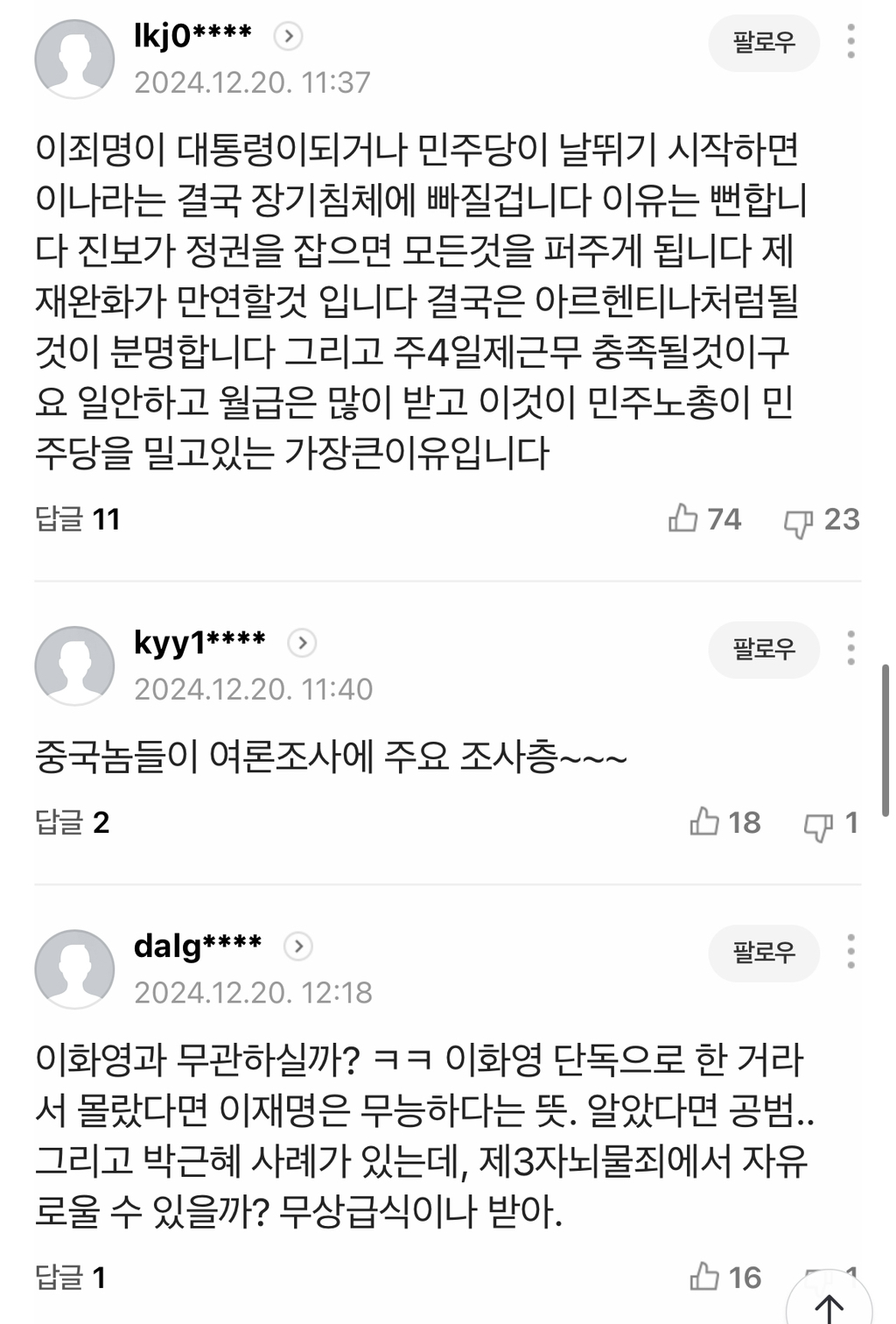 [여시뉴스데스크]여야 지지율 '더블 스코어'…이재명, 차기지도자 선호도 '1위' -> 할배들 몰려오는 중~~ 댓글 가자 🔥🔥 작성자ㅇㅇ엉어이|작성시간24.12.20|조회수834 목록 댓글 24 글자크기 작게가 글자크기 크게가 출처: https://naver.me/xExWzoq1여야 지지율 '더블 스코어'…이재명, 차기지도자 선호도 '1위' [한국갤럽]윤석열 대통령 탄핵소추안 통과 이후, 여야 지지율이 더블 스코어(2배 격차)를 기록했다는 여론조사 결과가 나왔다. 20일 한국갤럽이 발표한 12월 3주차 여론조사에서 더불어민주당은 지난주보다n.news.naver.com 다음검색 현재 게시글 추가 기능 열기 북마크 공유하기 신고 센터로 신고 댓글 댓글 24 댓글쓰기 답글쓰기 댓글 리스트 작성자칷빨리꺼져 | 작성시간 24.12.20 완 작성자MyBestChannel | 작성시간 24.12.20 완 작성자망고빙수 특대사이즈 | 작성시간 24.12.20 완 작성자자나깨나당뇨조심 | 작성시간 24.12.20 완 작성자스땁플리즈스땁플리즈 | 작성시간 24.12.20 완 댓글 전체보기