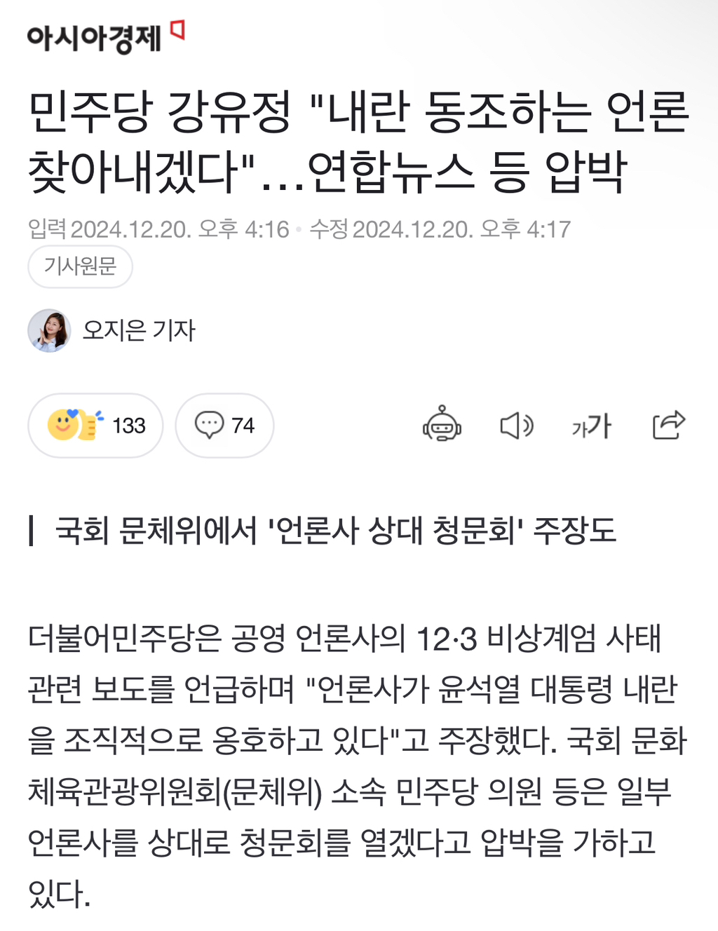 [여시뉴스데스크]민주당 강유정 "내란 동조하는 언론 찾아내겠다"…연합뉴스 등 압박 작성자소리앙|작성시간24.12.20|조회수1,498 목록 댓글 26 글자크기 작게가 글자크기 크게가 출처: https://naver.me/57VZhJLG민주당 강유정 "내란 동조하는 언론 찾아내겠다"…연합뉴스 등 압박더불어민주당은 공영 언론사의 12·3 비상계엄 사태 관련 보도를 언급하며 "언론사가 윤석열 대통령 내란을 조직적으로 옹호하고 있다"고 주장했다. 국회 문화체육관광위원회(문체위) 소속 민주n.news.naver.com전문출처 다음검색 현재 게시글 추가 기능 열기 북마크 공유하기 신고 센터로 신고 댓글 댓글 26 댓글쓰기 답글쓰기 댓글 리스트 작성자집회에서 만나 | 작성시간 24.12.20 완 작성자우린 초라 해 져도 다시 빛나 | 작성시간 24.12.20 완 작성자토리츠카레 | 작성시간 24.12.20 완 작성자올해꼭로또1등당첨될겁니다 | 작성시간 24.12.21 완 작성자망돔 | 작성시간 24.12.21 완 댓글 전체보기