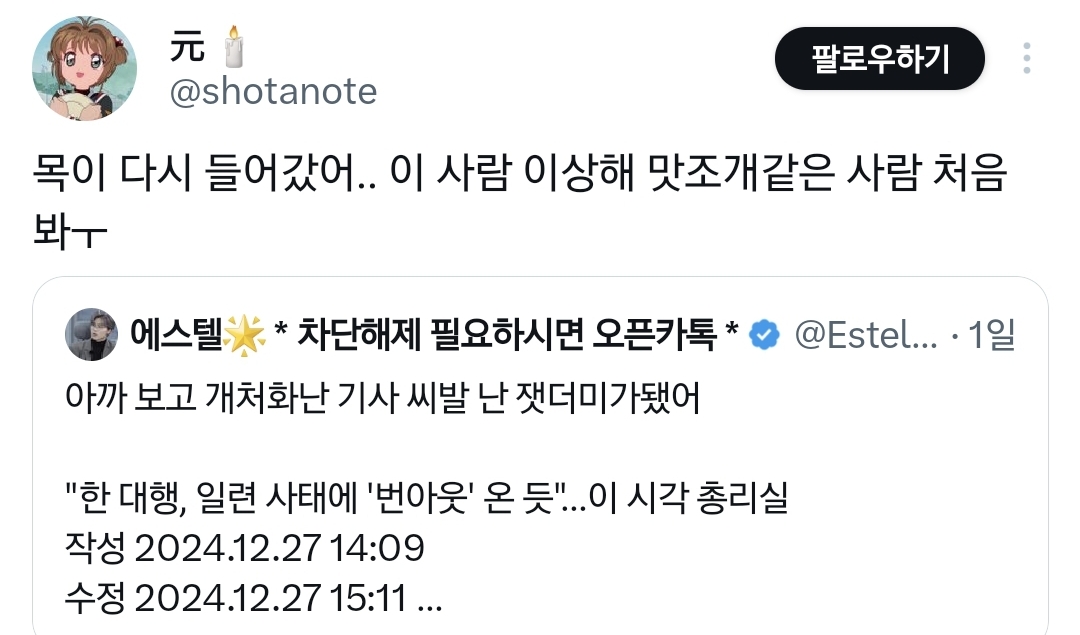 [흥미돋]한덕수 목이 다시 들어갔어.. 맛조개같은 사람 처음 봐ㅜ.twt 작성자스피또띠아|작성시간24.12.28|조회수15,539 목록 댓글 35 글자크기 작게가 글자크기 크게가 출처: https://x.com/hadess1138/status/1872894251132244326?t=GIePuxSEDFElD151b7Bz9g&s=19 여성시대 스피또띠아 맛조개 ㅇㅈㄹㅋㅋㅋㅋㅋㅋㅋㅋㅋ 다음검색 현재 게시글 추가 기능 열기 북마크 공유하기 신고 센터로 신고 댓글 댓글 35 댓글쓰기 답글쓰기 댓글 리스트 작성자I’m a cookie | 작성시간 24.12.28 일본사람같다 답댓글 작성자진정한아아 | 작성시간 24.12.28 22 답댓글 작성자유종철 | 작성시간 24.12.29 33 얼굴이걍 일본노인얼굴 작성자고양이 수염을 줍는 여자 | 작성시간 24.12.28 꿈에 나올까봐 무서운 턱ㄷㄷㄷㄷㄷ 작성자cherrycoke | 작성시간 24.12.28 맛조개 개미친ㅋㅋㅋㅋㅋㅋㅋㅋ 댓글 전체보기