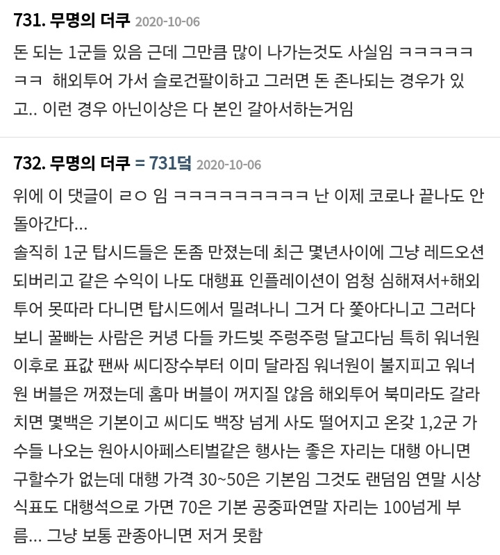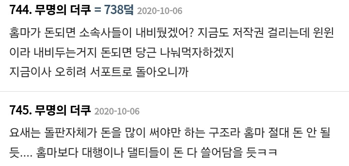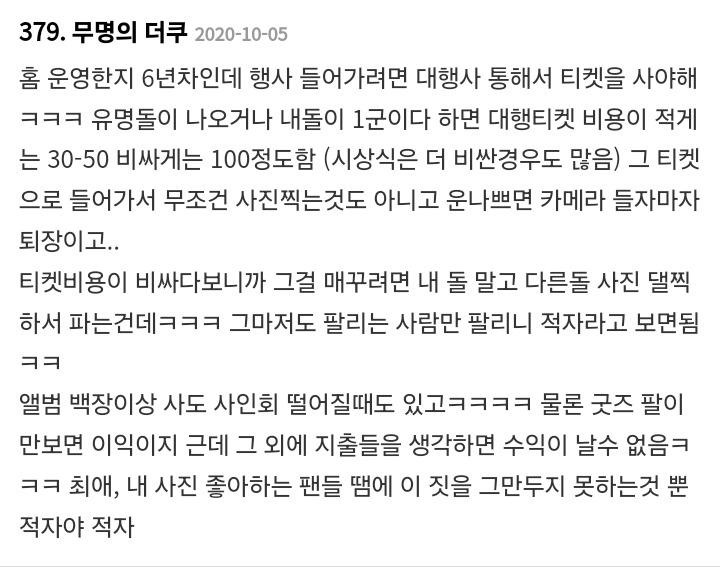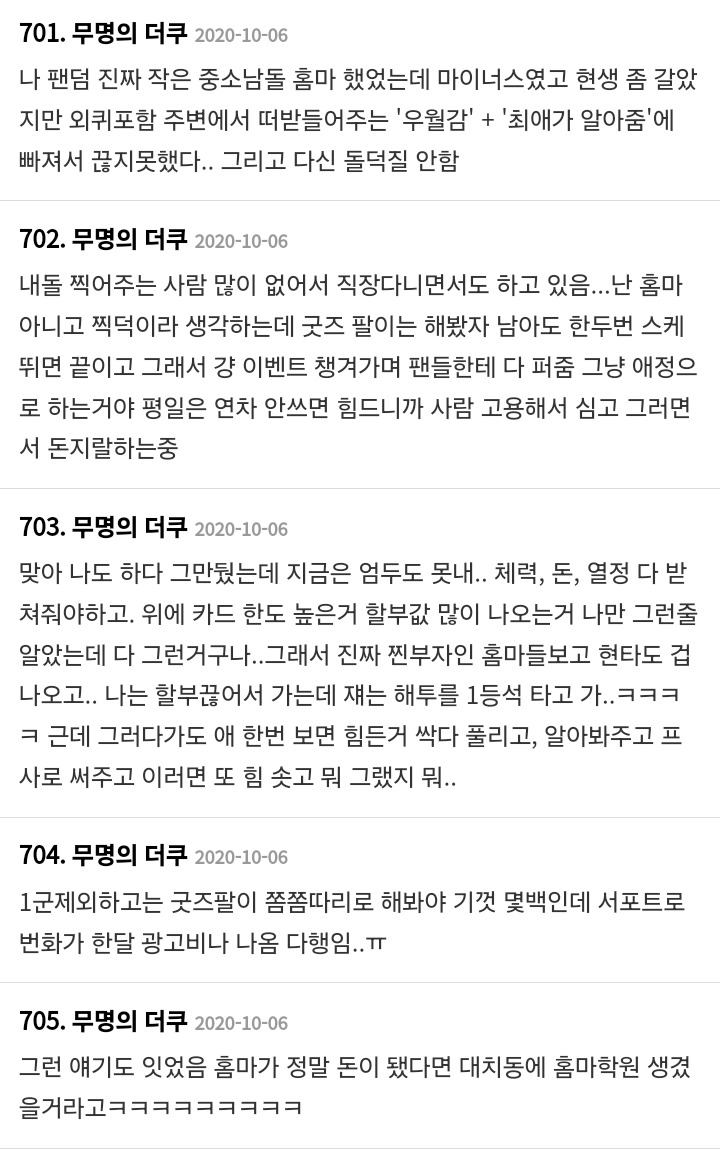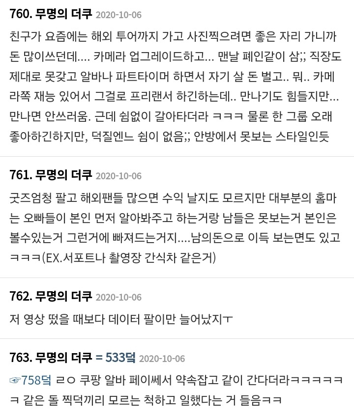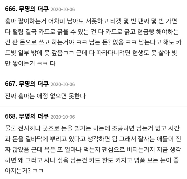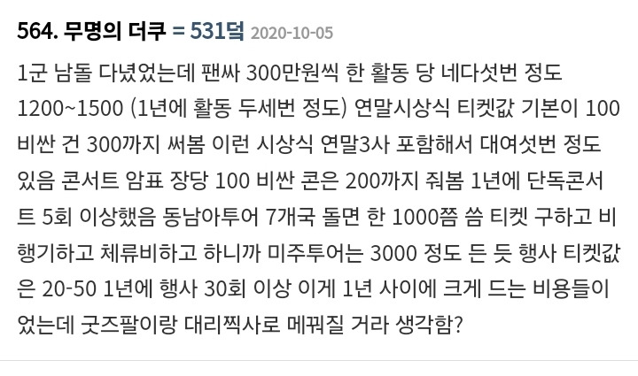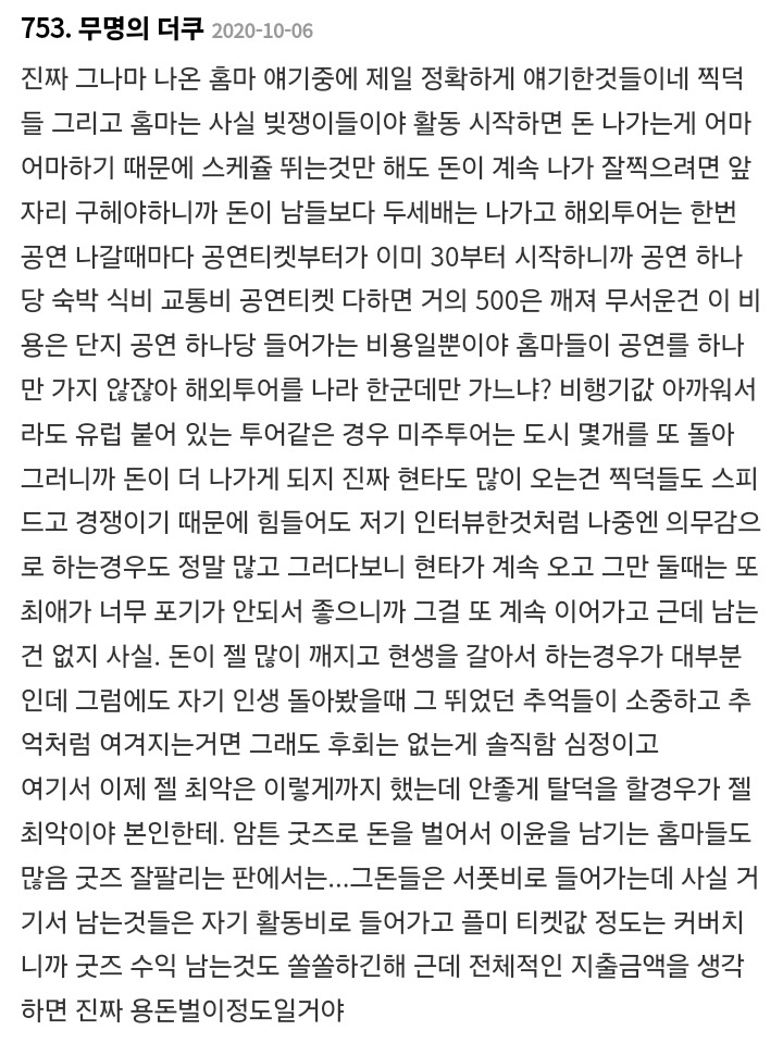 작성자해치해피 작성시간 25.01.03 홈마 돈 벌던 시절 다 지나갔지 뭐 ㅜ 내 친구는 실로 좀 많이 벌었음 ㅋㅋㅋ 그걸로 해투가는 거지만 애초에 해투 갈 돈을 버는 거잖아.. 그러고도 남긴 하더라..
