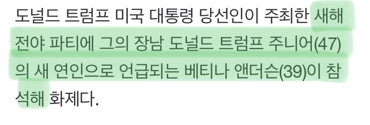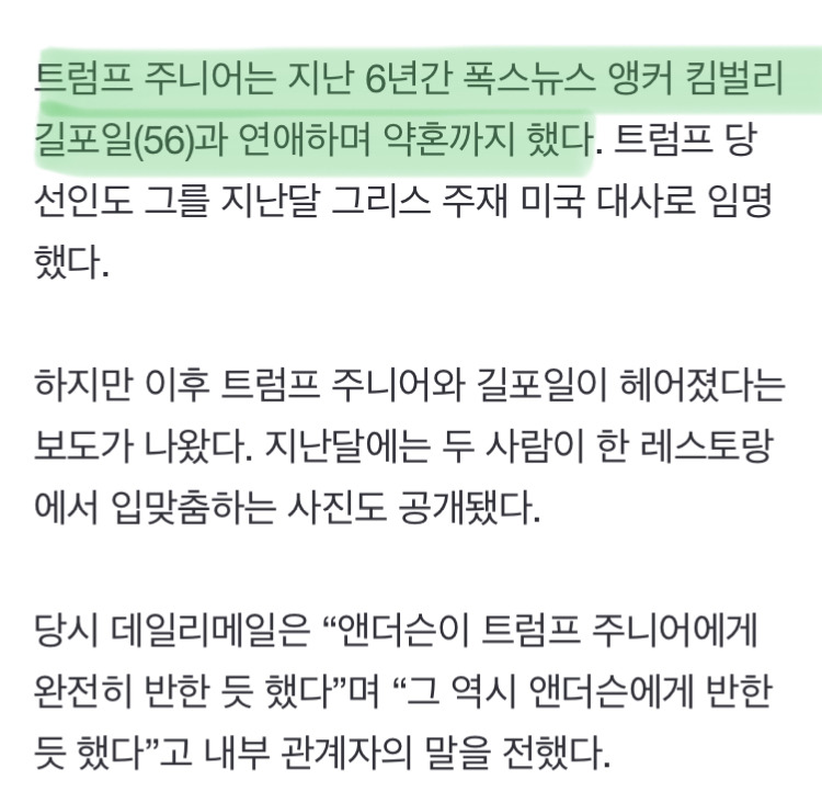 [여시뉴스데스크]6년 연애하고 약혼까지 했는데… 트럼프 장남이 ‘홀딱 반했다’는 새 여친 작성자(본인닉네임).|작성시간25.01.03|조회수12,651 목록 댓글 4 글자크기 작게가 글자크기 크게가 출처: https://n.news.naver.com/article/009/0005422751?sid=104 다음검색 현재 게시글 추가 기능 열기 북마크 공유하기 신고 센터로 신고 댓글 댓글 4 댓글쓰기 답글쓰기 댓글 리스트 작성자찬란하다 | 작성시간 25.01.03 엥 그럼 트럼프위해서 일하던 약혼녀는 뭐되는거야..;; 답댓글 작성자노마f | 작성시간 25.01.03 그리스 대사자리 줌 작성자질병관리청장 | 작성시간 25.01.03 자산가 명문가 사교계.. ㅋㅋㅋㅋ 작성자바늴라라테 | 작성시간 25.01.03 여자 다가졌네... 댓글 전체보기