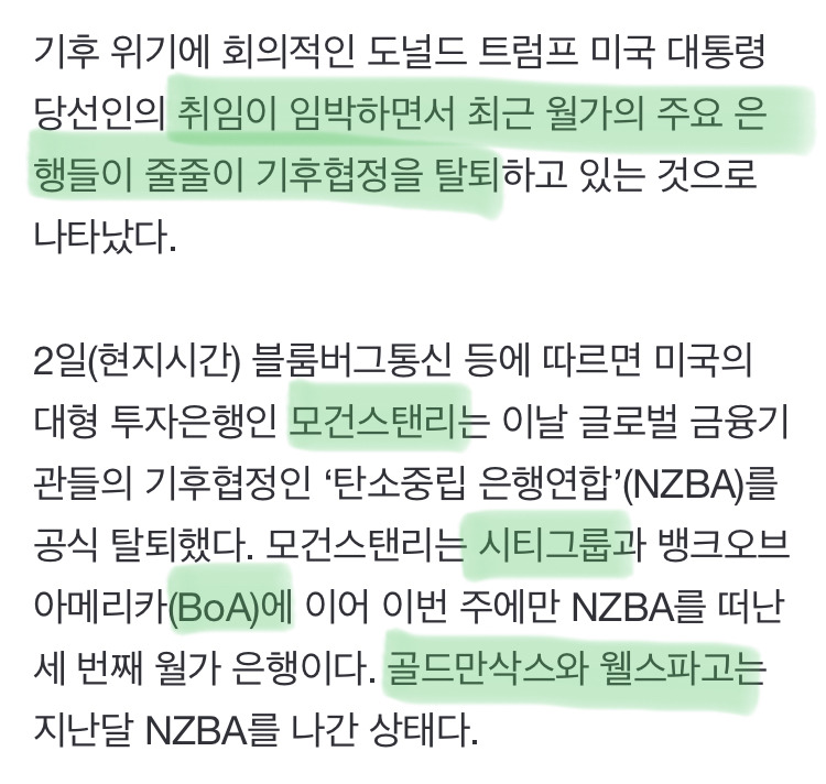 [여시뉴스데스크]트럼프 무서워… 월가 은행들, 기후협정 탈퇴 러시 작성자(본인닉네임).|작성시간25.01.03|조회수1,249 목록 댓글 6 글자크기 작게가 글자크기 크게가 출처: https://n.news.naver.com/article/277/0005527229?sid=104 다음검색 현재 게시글 추가 기능 열기 북마크 공유하기 신고 센터로 신고 댓글 댓글 6 댓글쓰기 답글쓰기 댓글 리스트 작성자2찍중하나가죽으면1찍이됩니다. | 작성시간 25.01.03 그래 돈싸들고 죽자! 작성자6도의 멸종 | 작성시간 25.01.03 해답은 agi밖에 없구나.. 작성자고운말을쓰...긴개뿔되겠냐 | 작성시간 25.01.03 하.... 작성자육차대멸종기 | 작성시간 25.01.03 민폐 작성자사우스코리아한강 | 작성시간 25.01.03 아 왜저래 진짜 댓글 전체보기
