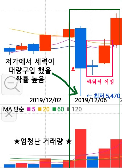 세력들이 끌어올려서 'A'가격에서 끝났는데