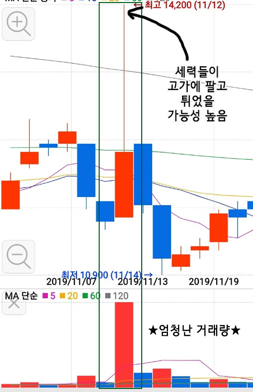 만약, 오른다해도 세력이 팔아치운 고점보다 높은 곳으로는 올라가기 힘듭니다.