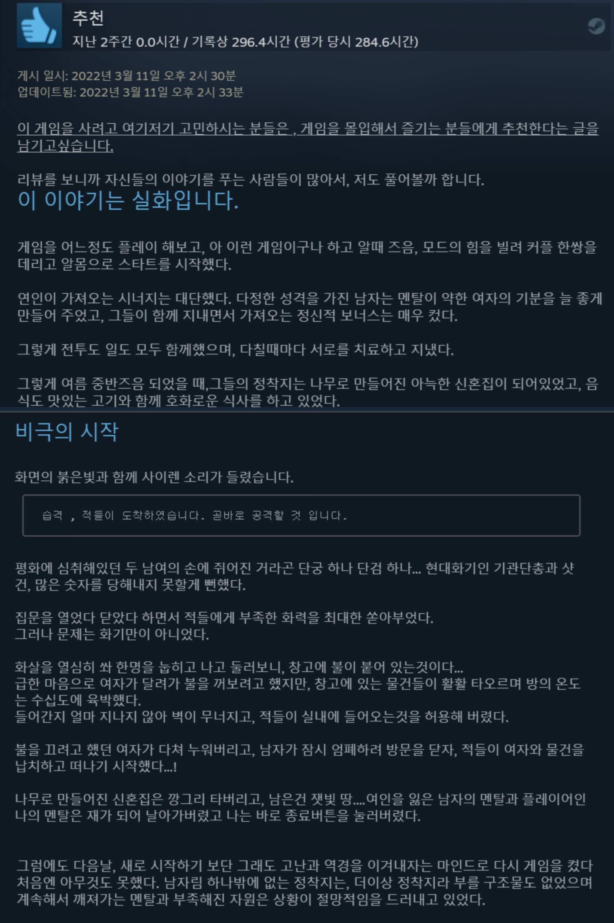 아직도 잊혀지지가 않는다. 그녀는 수류탄을 든 공병으로 우리의 외벽을 부수고 있었고, 그녀와 그의 사정을 모르는 다른 정착민들은 가장 먼저 치고들어온 그녀에게 총을 쐈다.