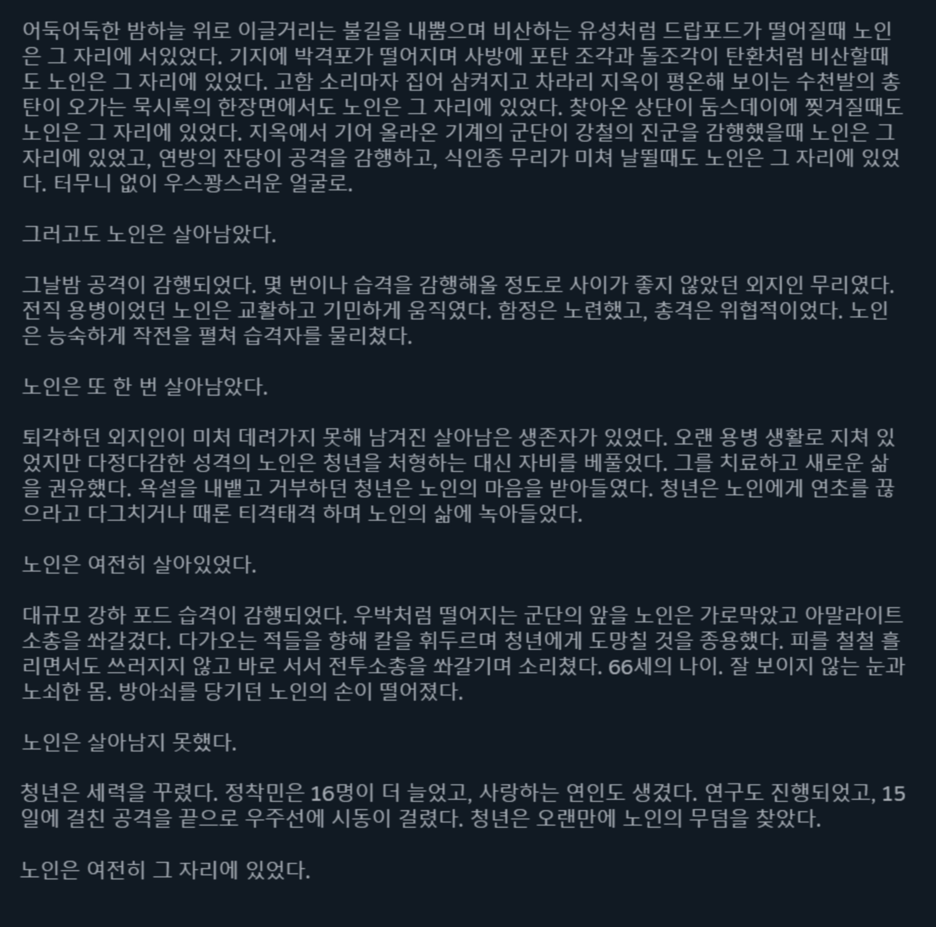 어둑어둑한 밤하늘 위로 이글거리는 불길을 내뿜으며 비산하는 유성처럼 드랍포드가 떨어질때 노인은 그 자리에 서있었다. 기지에 박격포가 떨어지며 사방에 포탄 조각과 돌조각이 탄환처럼 비산할때도 노인은 그 자리에 있었다. 고함 소리마자 집어 삼켜지고 차라리 지옥이 평온해 보이는 수천발의 총탄이 오가는 묵시록의 한장면에서도 노인은 그 자리에 있었다. 찾아온 상단이 둠스데이에 찢겨질때도 노인은 그 자리에 있었다. 지옥에서 기어 올라온 기계의 군단이 강철의 진군을 감행했을때 노인은 그 자리에 있었고, 연방의 잔당이 공격을 감행하고, 식인종 무리가 미쳐 날뛸때도 노인은 그 자리에 있었다. 터무니 없이 우스꽝스러운 얼굴로.