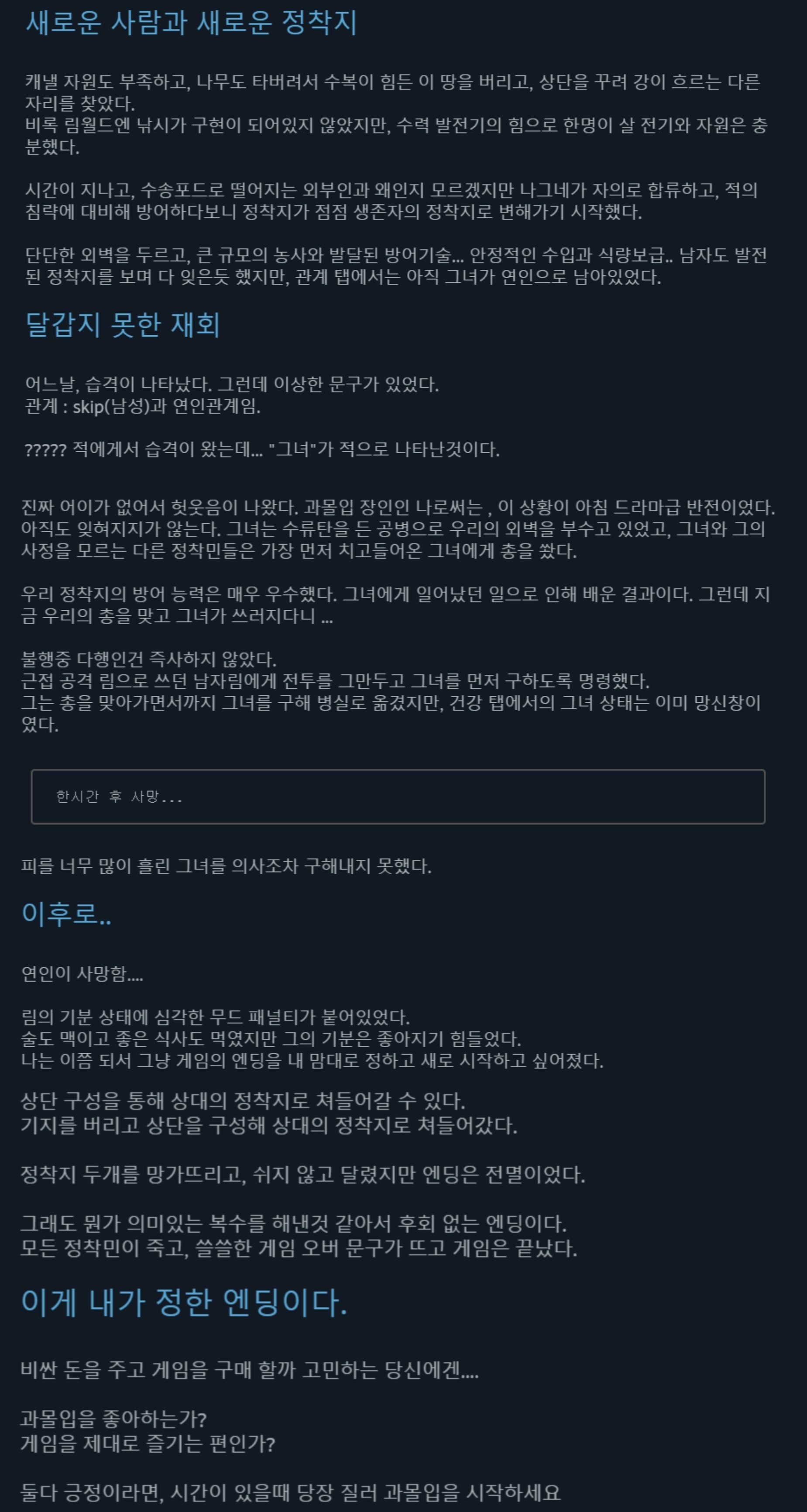 단단한 외벽을 두르고, 큰 규모의 농사와 발달된 방어기술... 안정적인 수입과 식량보급.. 남자도 발전된 정착지를 보며 다 잊은듯 했지만, 관계 탭에서는 아직 그녀가 연인으로 남아있었다.