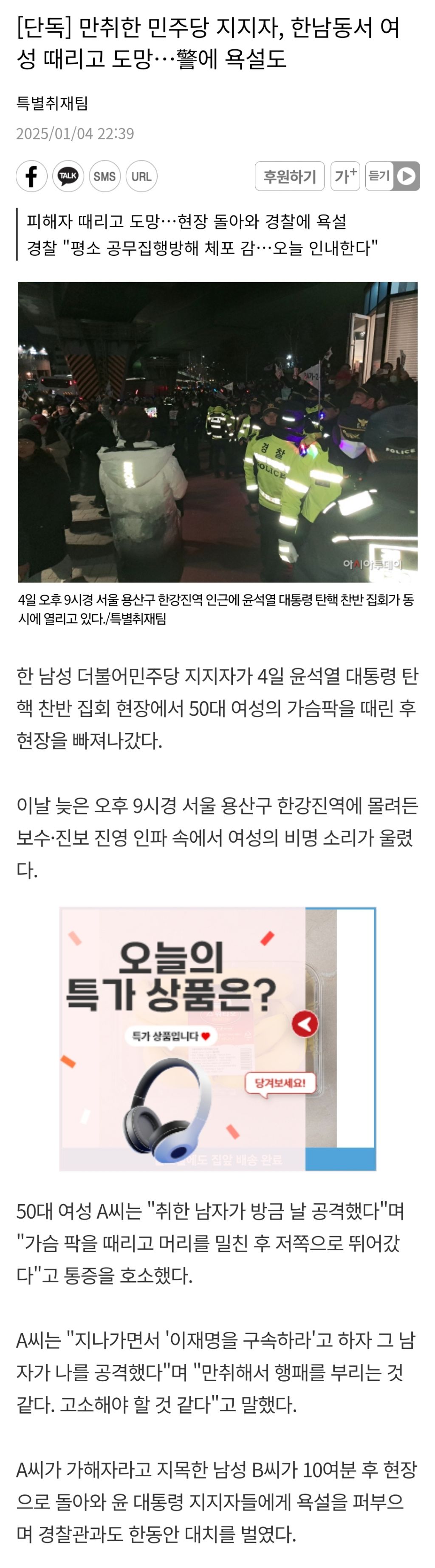 [여시뉴스데스크][단독] 만취한 민주당 지지자, 한남동서 여성 때리고 도망…警에 욕설도 작성자우리는할수있당|작성시간25.01.05|조회수4,977 목록 댓글 39 글자크기 작게가 글자크기 크게가 출처: 여성시대 (본인 닉네임)https://m.asiatoday.co.kr/kn/view.php?key=20250104010001755[단독] 만취한 민주당 지지자, 한남동서 여성 때리고 도망…警에 욕설도한 남성 더불어민주당 지지자가 4일 윤석열 대통령 탄핵 찬반 집회 현장에서 50대 여성의 가슴팍을 때린 후 현장을 빠져나갔다.이날 늦은 오후 9시경 서울 용산구 한강진역에 몰려든 보수·진보 www.asiatoday.co.kr댓글가줘 부탁!!!!!!!!!! 다음검색 현재 게시글 추가 기능 열기 북마크 공유하기 신고 센터로 신고 댓글 댓글 39 댓글쓰기 답글쓰기 댓글 리스트 작성자육차대멸종기 | 작성시간 25.01.05 또 선동하네 작성자안유쥔 | 작성시간 25.01.05 ? 반대였는데요 작성자115126 | 작성시간 25.01.05 아 저기레기새끼 작성자아아시럽추가 | 작성시간 25.01.05 기사제목을 왜 🤔 작성자wodowp | 작성시간 25.01.05 언론 진짜 개썩었다 댓글 전체보기