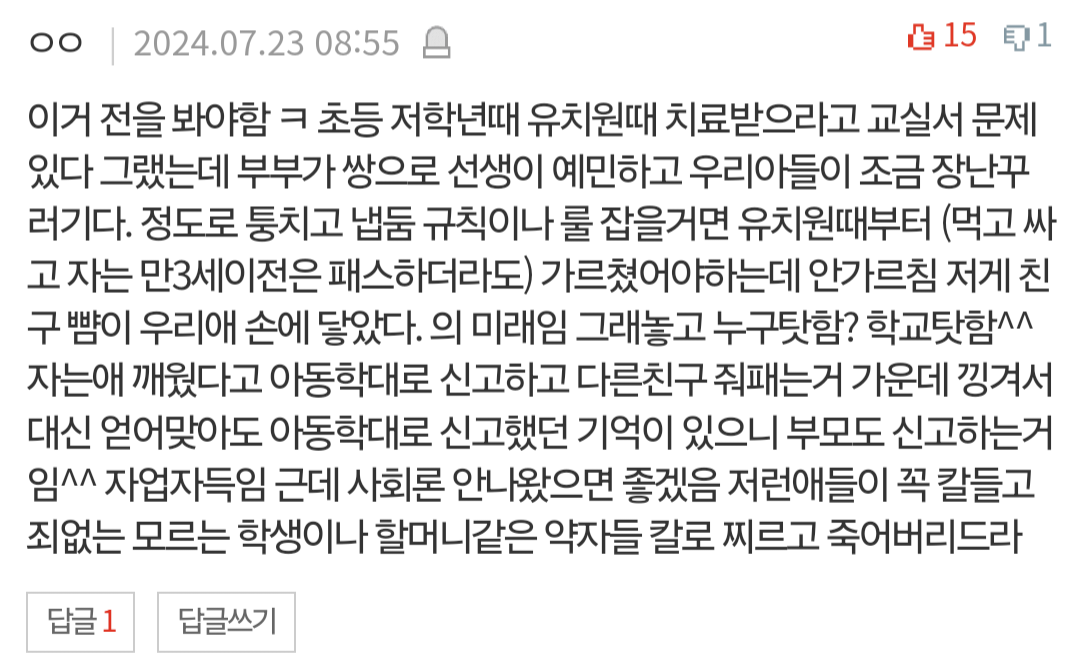 작성자따듯한아아 작성시간 25.01.05 나 초딩때 이유없이 괴롭히던 남자애 엄마한테 우리엄마가 전화했을때 그쪽 딸이 뭘 잘못했으니까 우리 애가 그랬겠죠 해가지고 아 말이 안통하는 집안이다 싶었는데 걔 20살때 오토바이 훔치다 현행범으로 잡혀감 그 뒤론 소식 못들었는데 걔가 과연 그 뒤엔 정상적으로 살았을까? 내 생각엔 절대 놉