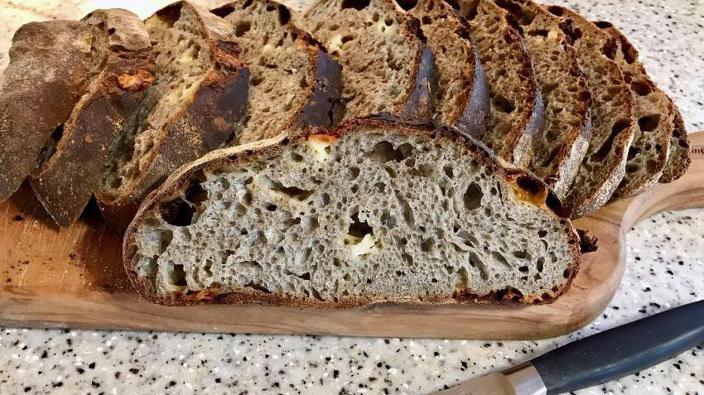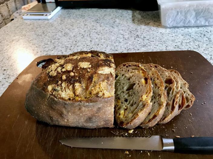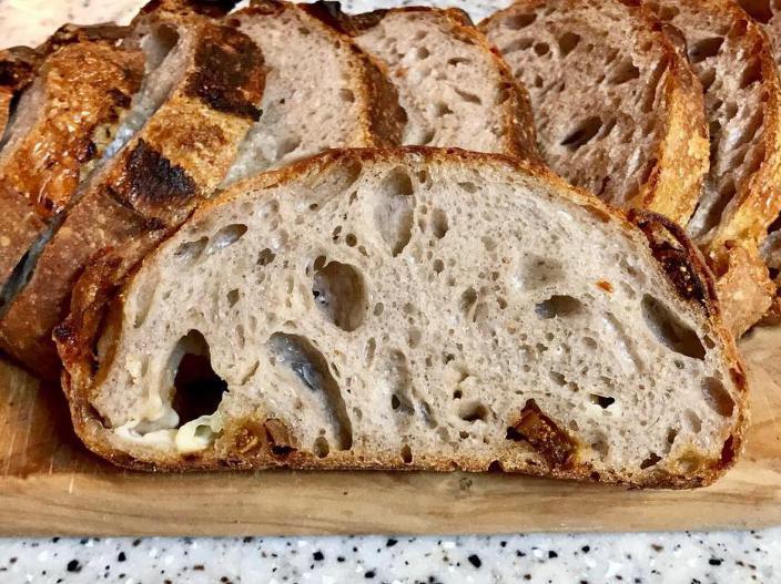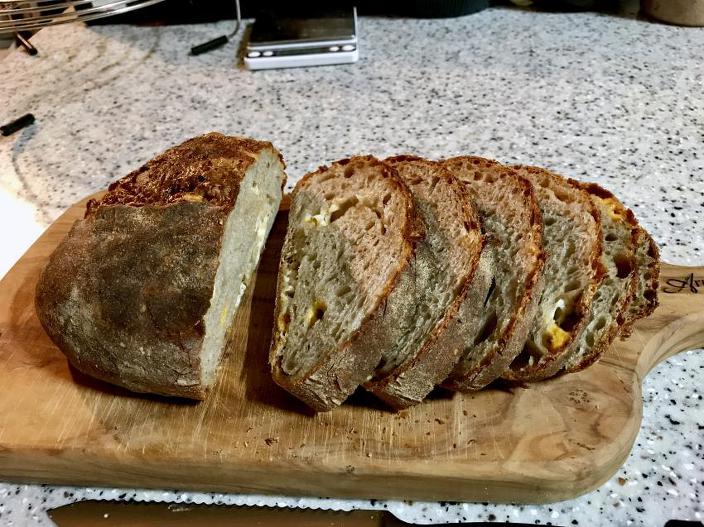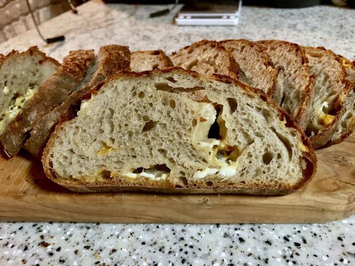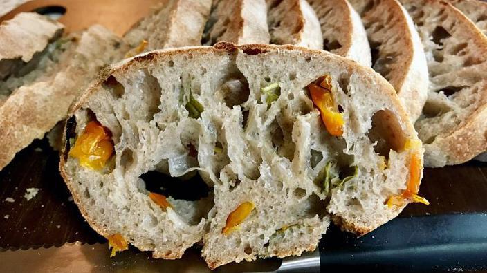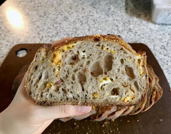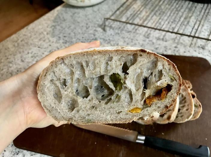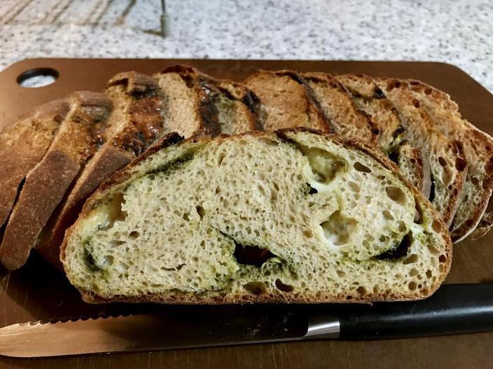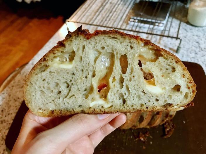 자두 액종 빵 착착 썰어서 띠요옹 액종으로 반죽하고 구운 빵은 빵 속살에서 그 과일 향이 은은하게 폴폴 풍겨서 참 좋아ㅎㅎ! 페퍼잭 치즈 통밀빵 속살이 쫀쫀하고 말랑해. 페퍼잭 치즈는 원래 잘 안 먹던 치즈인데 빵에 넣어서 구우니까 참 좋더라고ㅎㅎ. 스모키 콜비잭 치즈빵 반죽은 발효종에 강력분, 농가 호밀, 흑밀을 넣고 더치 커피 원액을 10g정도 더해넣었어. 콜비잭 치즈도 듬뿍 듬뿍 넣고 허브 섞은 것도 조금 뿌린 뒤 굽굽.. 올리브오일 듬뿍 넣고 만든 치아바타 타르틴 슬랩 브레드가 갑자기 너무 먹고 싶어서 충동적으로 반죽하고 구웠어ㅎㅎ. 호밀이랑 흑밀이 들어가서 밀기울도 보이고 색이 거뭇거뭇해. 바질 페스토 빵 |