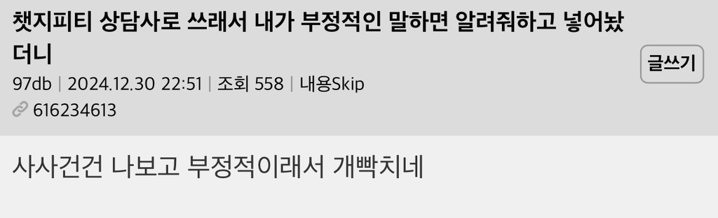 [흥미돋]챗지피티 상담사로 쓰래서 내가 부정적인 말하면 알려줘하고 넣어놨더니 작성자MoMAA|작성시간25.01.05|조회수23,222 목록 댓글 3 글자크기 작게가 글자크기 크게가 출처: https://hygall.com/616234613 다음검색 현재 게시글 추가 기능 열기 북마크 공유하기 신고 센터로 신고 댓글 댓글 3 댓글쓰기 답글쓰기 댓글 리스트 작성자ㄴ호두엄마ㄱ | 작성시간 25.01.05 ㅋㅋㅋㅋㅋ 작성자똥땡띵 | 작성시간 25.01.05 ㅋㅋㅋㅋㅋ챗지피티 똑똑하네 작성자딜탱 | 작성시간 25.01.06 네 안의 버럭이를 인정해야되 ㅋㅋㅋㅋ 댓글 전체보기
