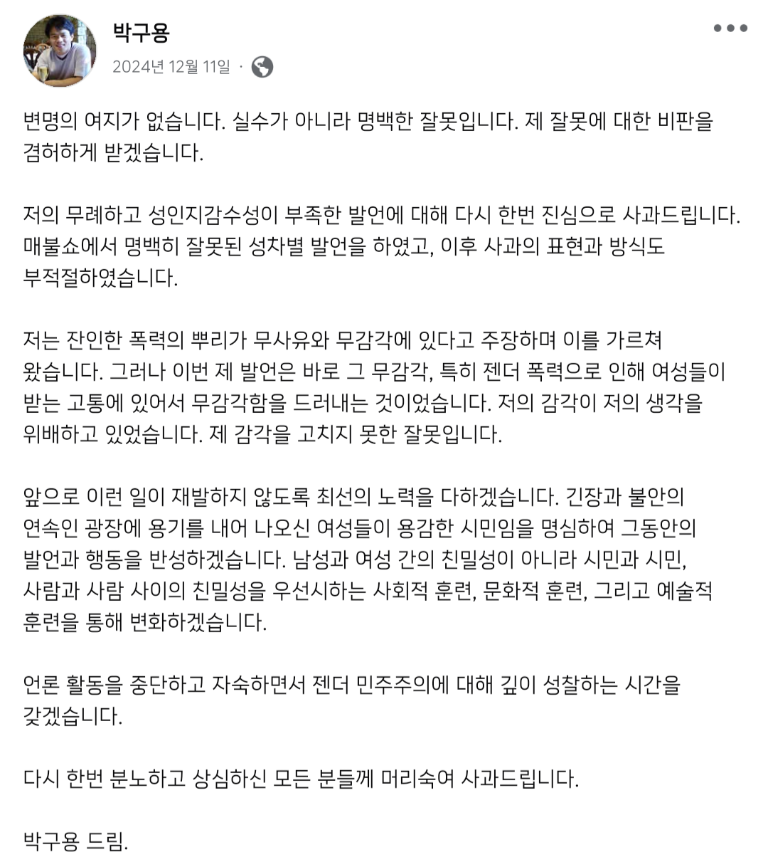 - 방송 끝나고 나서 바로 발언의 문제점을 인지하지 못했음