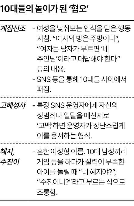 25일 성교육기관과 젠더 전문가 등에 따르면 10대 남성들 사이에서는 사회관계망서비스(SNS)를 통해 '계집신조'라는 글이 많이 공유되고 있다. '여자들이 마땅히 따라야 할 행동'이라며 누군가 정리한 글이다. 예컨대 '여자 목소리는 80데시벨(㏈)을 넘겨서는 안 된다'거나 '여자는 남자가 부르면 3초 안에 대답해야 한다', '여자가 입을 수 있는 치마는 앞치마뿐이다' 등의 내용이 담겨 있다. 과거 '삼일한(여자는 3일에 한 번씩 맞아야 한다는 뜻)' 등의 혐오표현이 극단 성향의 남초 커뮤니티에서 쓰였는데 이제는 SNS를 타고 퍼지고 있는 것이다.