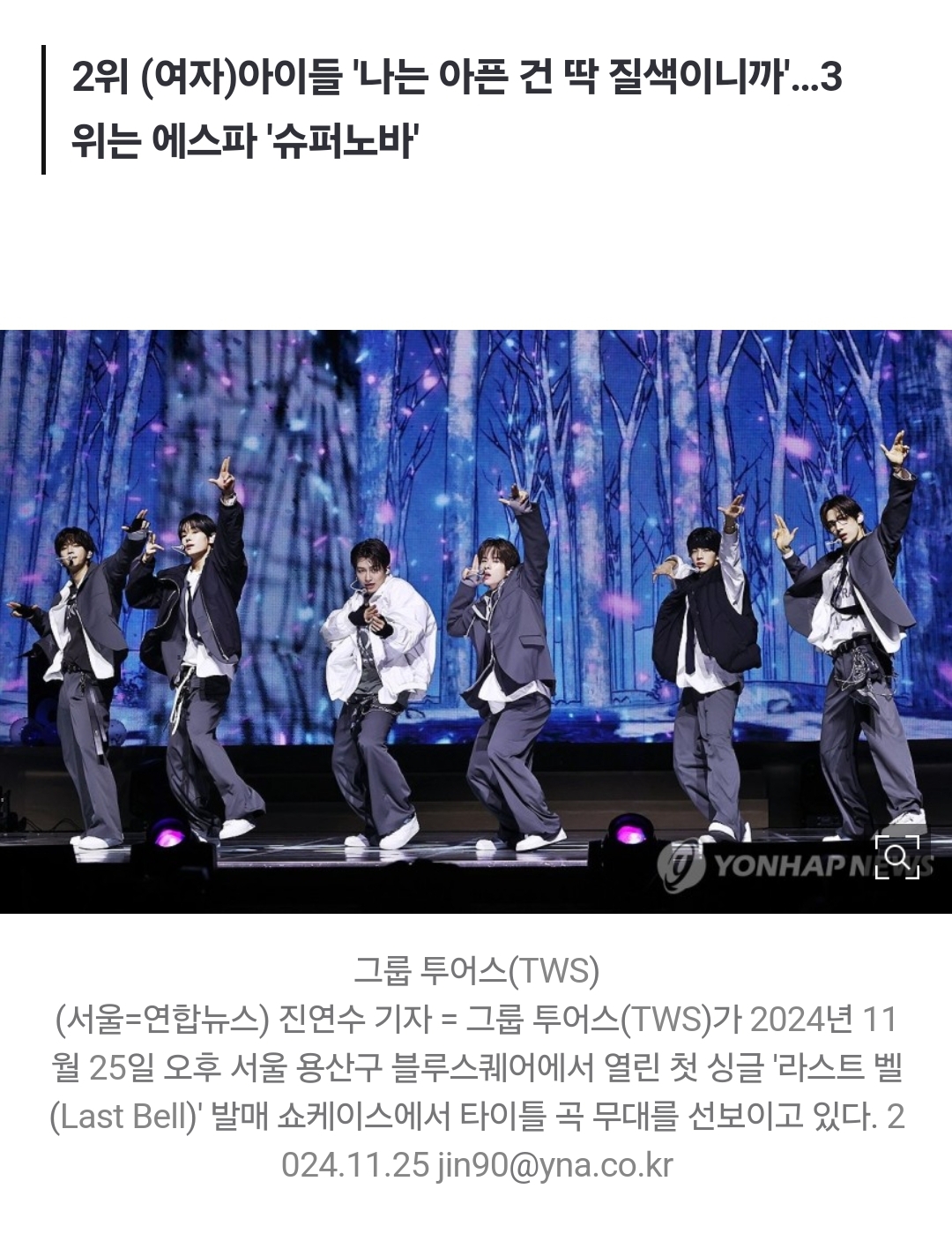 [여시뉴스데스크]작년 멜론 연간 1위는 TWS '첫 만남은 계획대로 되지 않아' 작성자xibsno|작성시간25.01.09|조회수2,582 목록 댓글 50 글자크기 작게가 글자크기 크게가 출처: https://naver.me/5k7G5NQJ작년 멜론 연간 1위는 TWS '첫 만남은 계획대로 되지 않아'2위 (여자)아이들 '나는 아픈 건 딱 질색이니까'…3위는 에스파 '슈퍼노바' 지난해 국내 대표 음원 플랫폼 멜론에서 가장 사랑받은 노래는 신인 투어스(TWS)의 데뷔곡 '첫 만남은 계획대로 되지 않n.news.naver.com 다음검색 현재 게시글 추가 기능 열기 북마크 공유하기 신고 센터로 신고 댓글 댓글 50 댓글쓰기 답글쓰기 댓글 리스트 작성자국회앞단두대 | 작성시간 25.01.09 유툽뮤직 쓰는데 내 연간 리캡 1위도 이거더라 ㅜ ㅋㅋㅋ 한동안 꽂혀서 계속 듣긴 했는데 이정도로 들었을줄은 몰랐고요.. 작성자초록부리새앙쥐 | 작성시간 25.01.09 별로 안듣고싶은데 유툽 알고리즘으로 계속 나와서 쩔수없이 들음 ㅜ 작성자꿈꾸는정원 | 작성시간 25.01.09 넘 조아서 내가 백만번 들은듯 작성자꼬질한강아지를사랑해 | 작성시간 25.01.09 노래가너므너므조아 작성자샹들리히 | 작성시간 25.01.09 이거노래개좋은데 댓글 전체보기