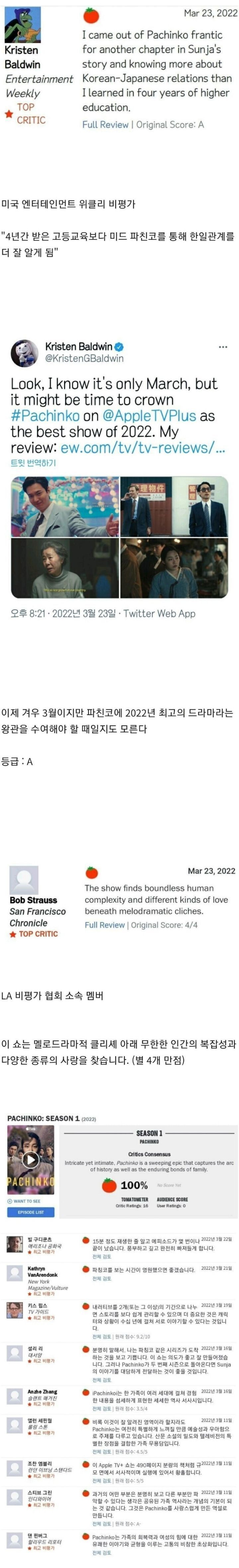 다음은 각종 매체와 비평가들의 <파친코>에 대한 평들입니다.