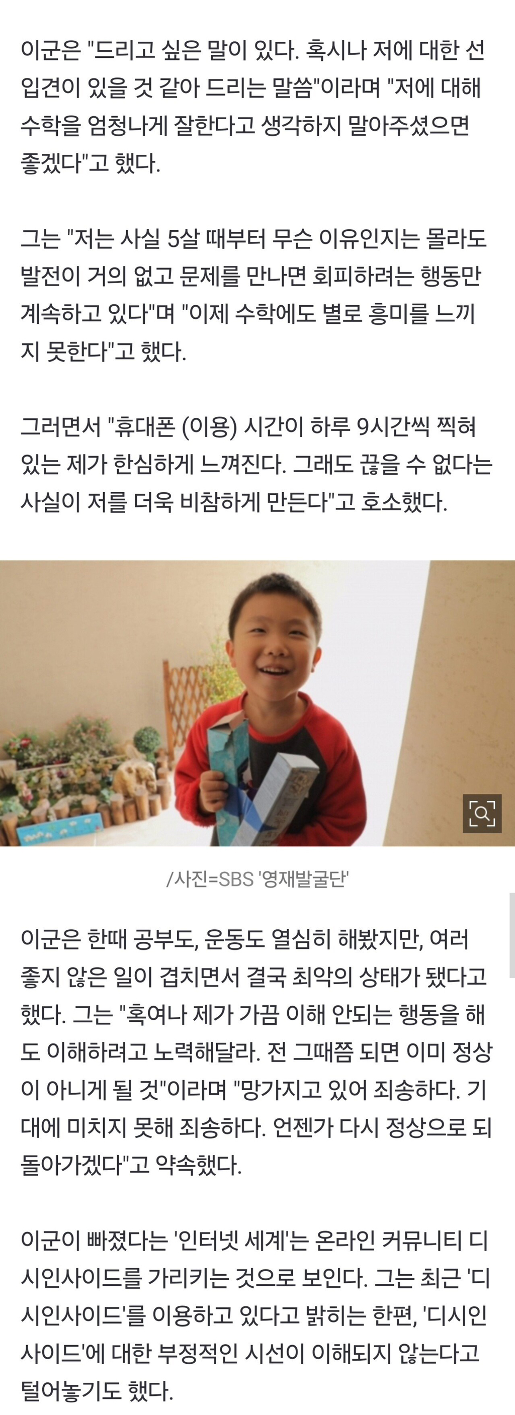 [기타]영재발굴단 수학천재로 나온 6살 근황ㄷㄷ 작성자tytyty|작성시간25.01.10|조회수38,060 목록 댓글 181 글자크기 작게가 글자크기 크게가 출처: 여성시대 tytytyhttps://n.news.naver.com/article/008/0005139387?sid=102'영재발굴단' 6살 수학천재, 직접 전한 근황…"망가져서 죄송합니다"SBS '영재발굴단'에 출연한 수학 천재 이정우(11)군이 더는 수학에 흥미를 못 느끼고 있다고 털어놨다. 이군은 지난 6일 유튜브를 통해 "점점 인터넷 세계로 빠져들고, 잠도 늦게 자며 제 인생은 점n.news.naver.com망가졌다는데 이게 10살짜리가 쓴글이라고 다음검색 현재 게시글 추가 기능 열기 북마크 공유하기 신고 센터로 신고 댓글 댓글 181 댓글쓰기 답글쓰기 댓글 리스트 작성자느개비단의 습격 | 작성시간 25.01.11 디지털 디톡스 ㄱ 제발 작성자2028 | 작성시간 25.01.11 정신차려라 작성자도롱뇽과 친구들 | 작성시간 25.01.11 “남아” 작성자커피포리 | 작성시간 25.01.12 이명박 진짜 잘못된 걸 ... 일베 디시 이런거 다 바로잡아야한다 작성자아침이슳 | 작성시간 25.01.13 https://m.cafe.daum.net/subdued20club/ReHf/5173912?svc=cafeapp연어완... 댓글 전체보기