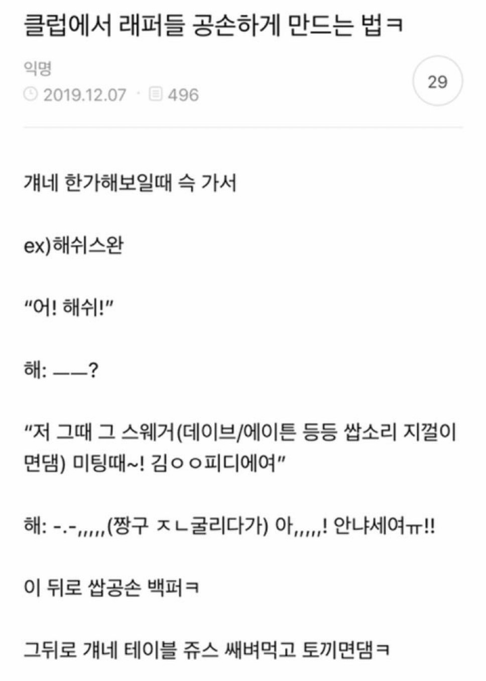 [흥미돋]클럽에서 래퍼들 공손하게 만드는 법 바비한테 써먹어야지 작성자배고플땐 과자방|작성시간25.01.10|조회수11,050 목록 댓글 15 글자크기 작게가 글자크기 크게가 출처: 여성시대 배고플땐 과자방, X @heunghacnayoㅋㅋㅋㅋㅋㅋㅋㅋㅋㅋ+ 실제로 써먹은 여시도 있다네요 꿀팁이니까 꼭 알아두길!! 다음검색 현재 게시글 추가 기능 열기 북마크 공유하기 신고 센터로 신고 댓글 댓글 15 댓글쓰기 답글쓰기 댓글 리스트 작성자우리집고양이가최고야 | 작성시간 25.01.10 아 시핥ㄱㅌㅋㄱㅋㄱㅋㄱㅋㄱㅋㄱㅋㄱㅋㅅ 개웃ㄱ김 작성자귀여운글에댓달고우는여시 | 작성시간 25.01.10 ㅋㅋㅋㅋㅋㅋㅋㅋㅋ 진수는 바비한테 밥도 얻어먹어도 됨ㅋㅋㅋㅋㅋㅋㅋㅋㅋㅋ 작성자유유유흑흑 | 작성시간 25.01.10 ㅋㅋㅋㅋㅋㅋㅋㅋㅋㅋㅈㄴ웃겨 작성자불규칙한 생활을 규칙적으로 합니다 | 작성시간 25.01.10 써먹은 여시가있다니ㅋㅋㅋㅋㅋㅋ 작성자훈제연하먹고싶다 | 작성시간 25.01.10 데이브 에이튼이 존나 찐같아섴ㅋㅋㅋ 댓글 전체보기