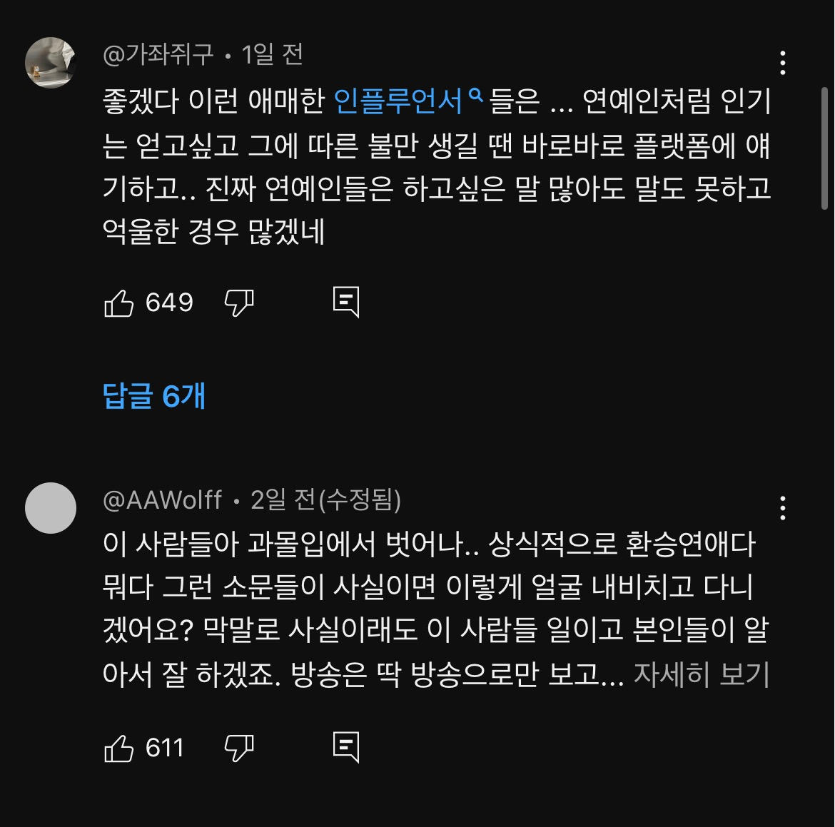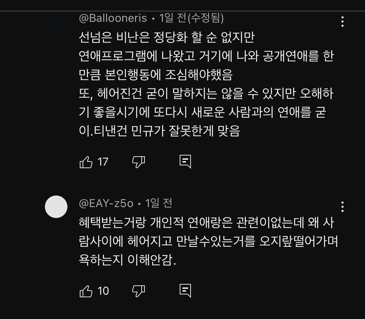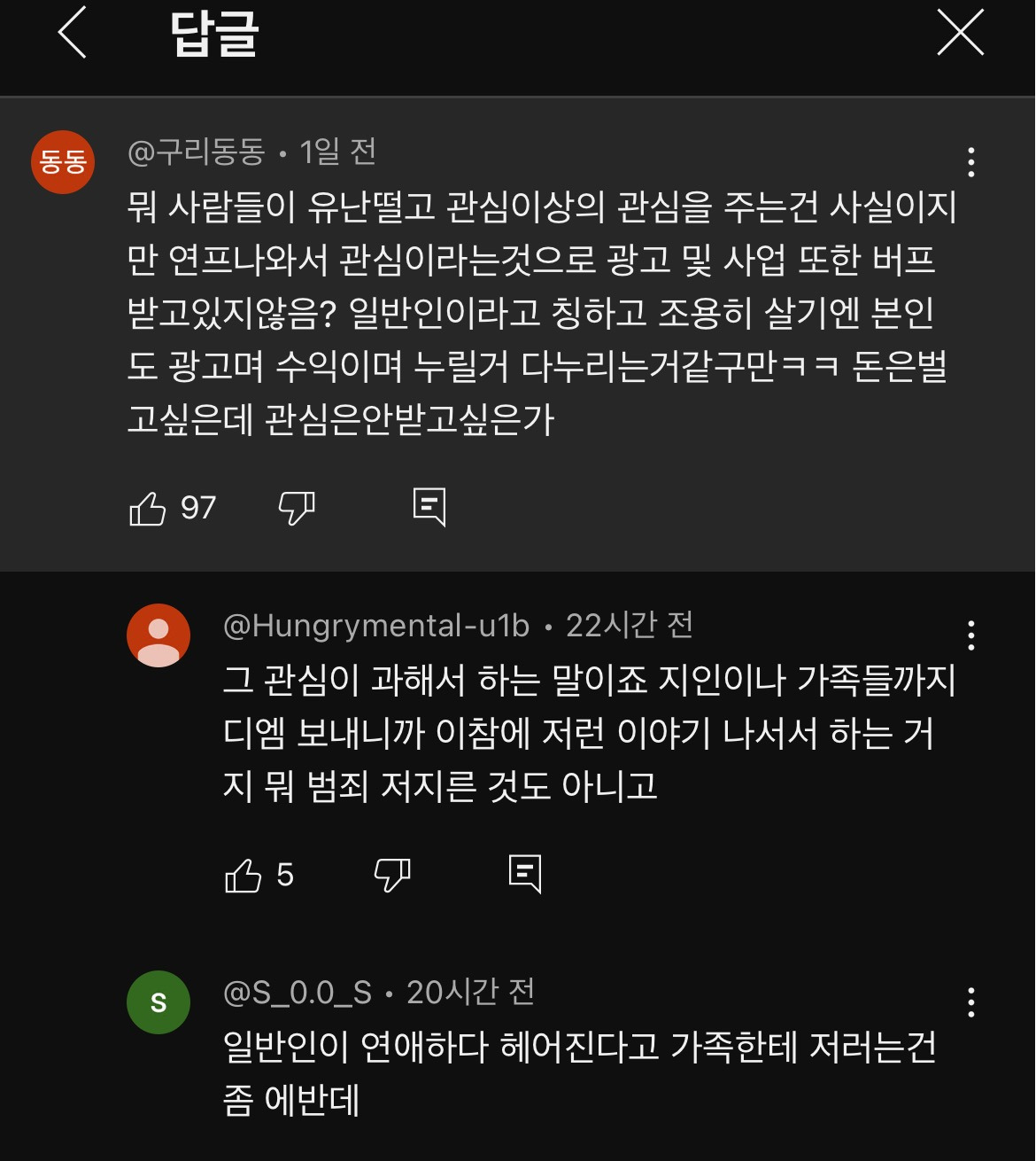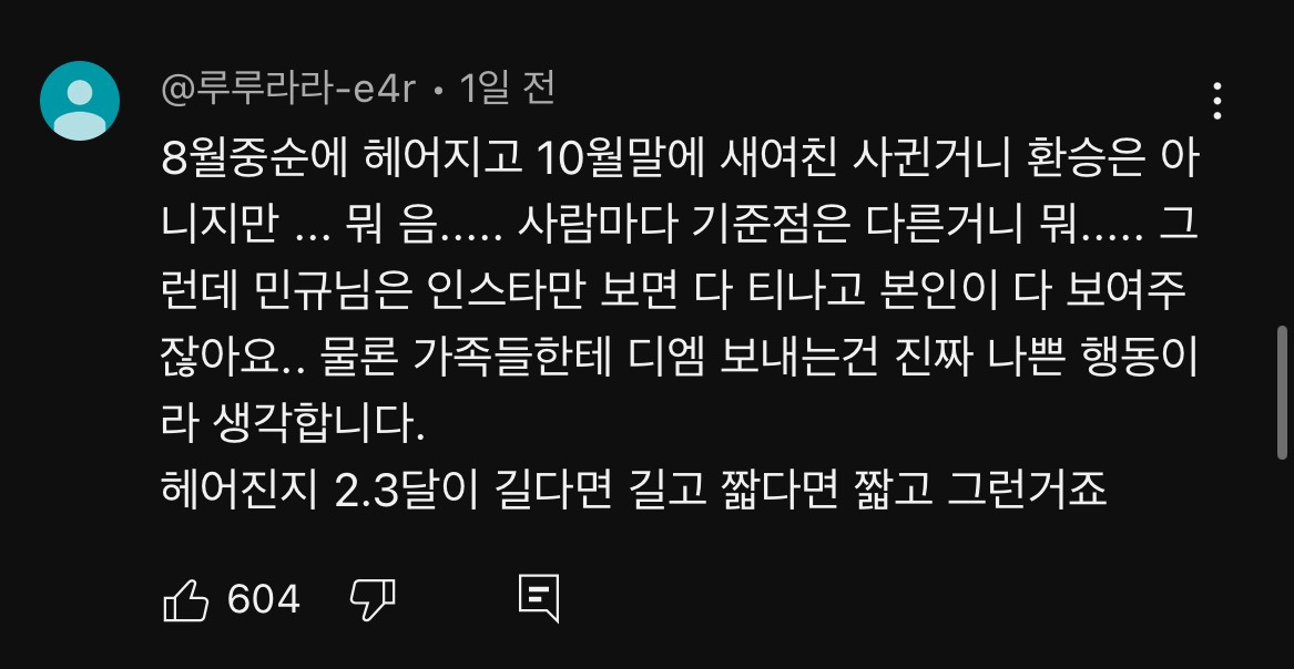 작성자3.111175₩ 작성시간 25.01.11 유튜브 댓글 개신기하네 ; 방송 나와서 돈벌고 있으니까 저런 짓 정도는 봐줘야 한다는건가 ?? 당연히 가족한테 디엠하고 스토커 짓 하는게 비정상인건데 ;; 그리고 자세한 내막도 모르면서 환승이니 뭐니 .. 아니 2달 만에 사귀는게 머가 어때서 ????????? ㄹㅇ 의문 지맘이지