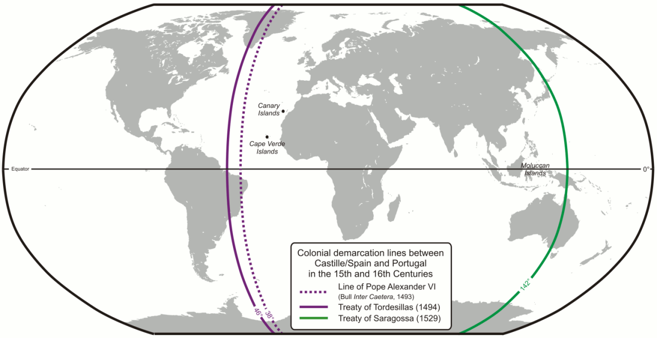 교황 알렉산데르 6세의 중재 아래 지도에 쭉 선 긋고