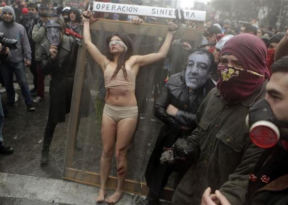 규탄의 의미로 피노체트 집권 당시 행해졌던 고문을 재현하는 것이라고 한다