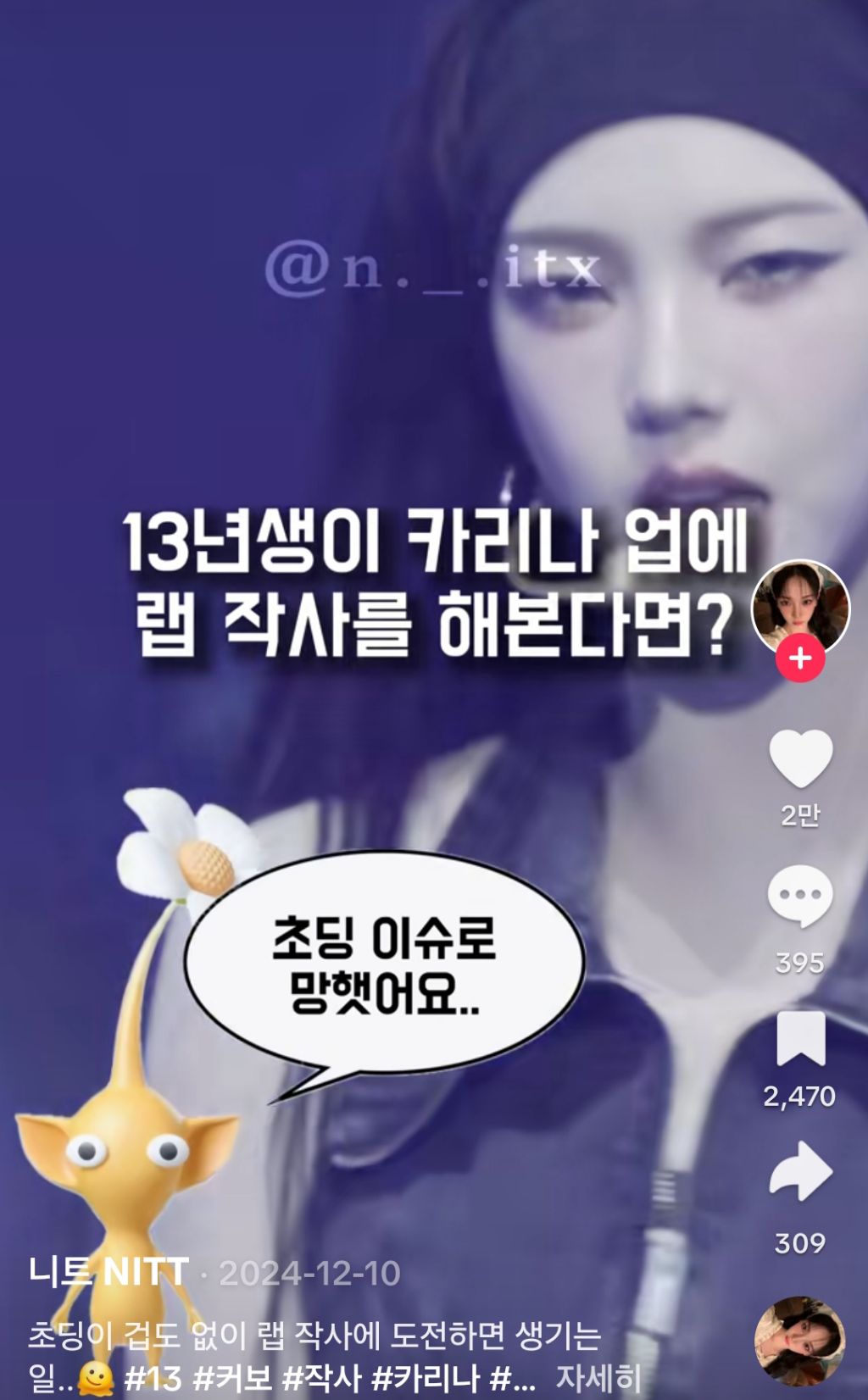 [흥미돋]2013년생이 카리나 "업"에 랩 작사를 해본다면?! 작성자잇츠쇼타임|작성시간25.01.13|조회수5,342 목록 댓글 4 글자크기 작게가 글자크기 크게가 출처: 여성시대 잇츠쇼타임https://vt.tiktok.com/ZS6xjuD2v/TikTok · 니트 𝗡𝗜𝗧𝗧 님좋아요 19.8K개, 댓글 395개가 있습니다. "초딩이 겁도 없이 랩 작사에 도전하면 생기는 일..🫠"www.tiktok.com 다음검색 현재 게시글 추가 기능 열기 북마크 공유하기 신고 센터로 신고 댓글 댓글 4 댓글쓰기 답글쓰기 댓글 리스트 작성자너와 나의 미래는 Be happy야 | 작성시간 25.01.13 아니 데뷔하세여.. 작성자왕초코소라빵 | 작성시간 25.01.13 잘하네!! 작성자내가 안뽑았는데 좆뺑이치는 중 | 작성시간 25.01.13 13년생이 몇살이야... 쇼미나가자 작성자염염긋 음 야미 딜리셔스 | 작성시간 25.01.13 우와 ㅠㅠㅠ 애기야 너는 꼭 이 길로 가걸아...... 댓글 전체보기