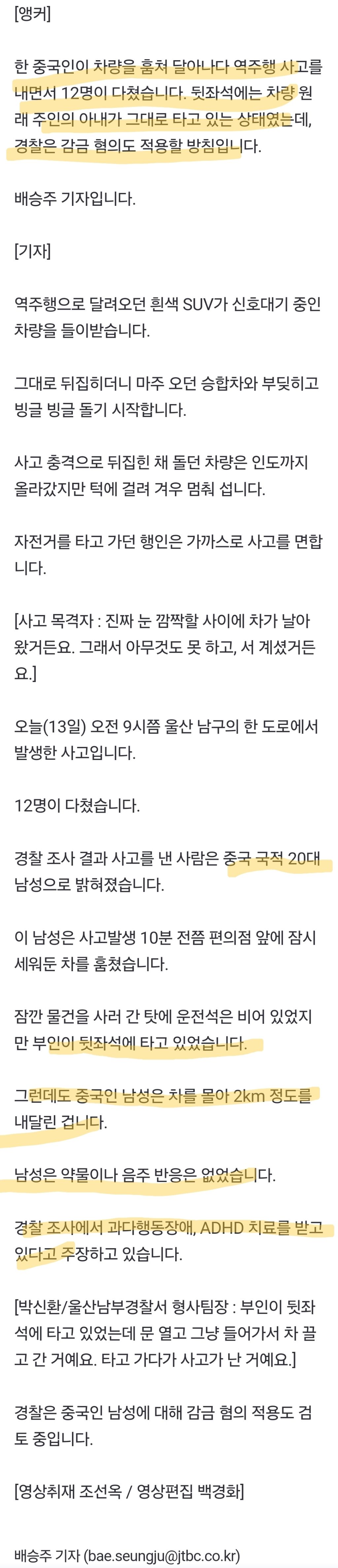 [여시뉴스데스크]뒷자리 사람 있는데…20대 중국인, 차량 훔쳐 '역주행 작성자알빠아님|작성시간25.01.14|조회수2,623 목록 댓글 5 글자크기 작게가 글자크기 크게가 출처: https://naver.me/5BcF2hhB뒷자리 사람 있는데…20대 중국인, 차량 훔쳐 '역주행'한 중국인이 차량을 훔쳐 달아나다 역주행 사고를 내면서 12명이 다쳤습니다. 뒷좌석에는 차량 원래 주인의 아내가 그대로 타고 있는 상태였는데, 경찰은 감금 혐의도 적용할 방침입니다. 배승n.news.naver.com 다음검색 현재 게시글 추가 기능 열기 북마크 공유하기 신고 센터로 신고 댓글 댓글 5 댓글쓰기 답글쓰기 댓글 리스트 작성자어쩌면조취 | 작성시간 25.01.14 ㅁㅊ 아내분 개놀랐겠다ㅠㅠ 이래서 중국놈들은.... 작성자욕하쥐마아 | 작성시간 25.01.14 짱깨들 빨리 내쫓아 작성자레몬딸기초코 | 작성시간 25.01.14 미친놈이; 작성자내란수괴물 | 작성시간 25.01.14 와 자전거 타신 분은 천운이다 ㅜㅜ 작성자앙옹아요앵으 | 작성시간 25.01.14 미친 저럴때 뒤에서 목 졸라도 돼? 댓글 전체보기