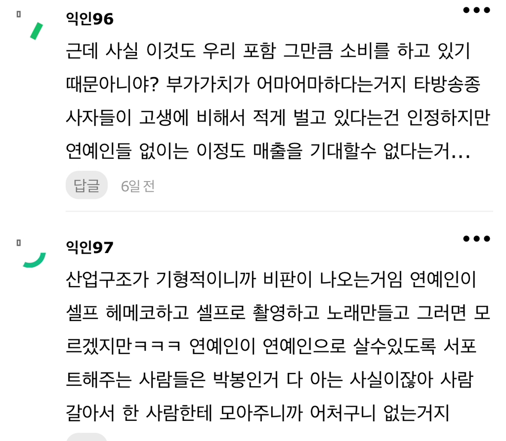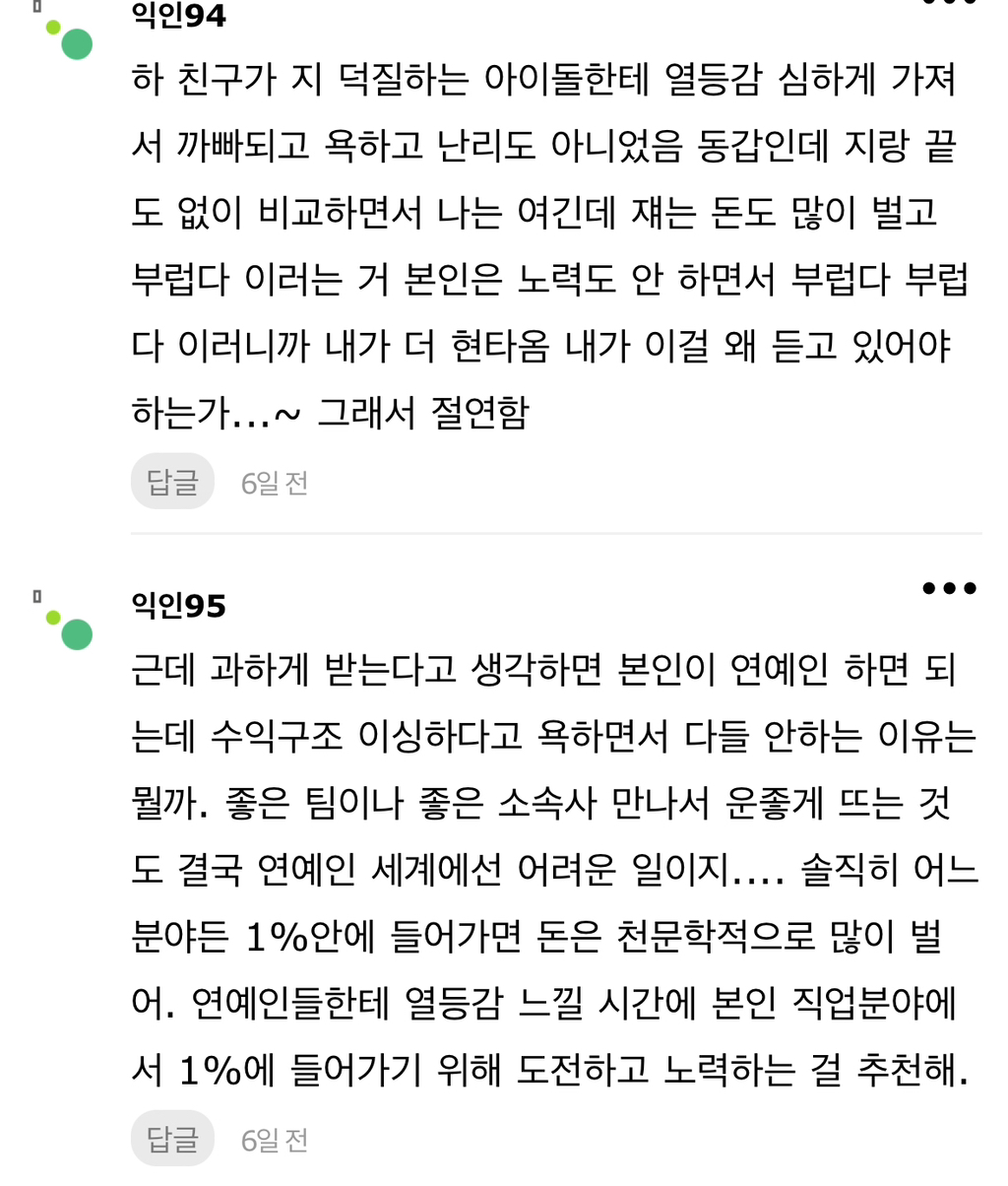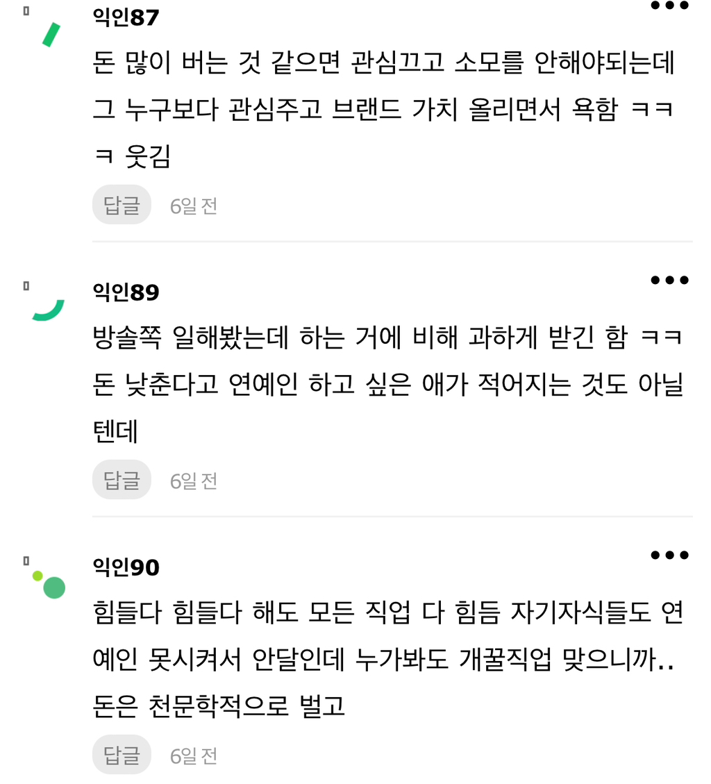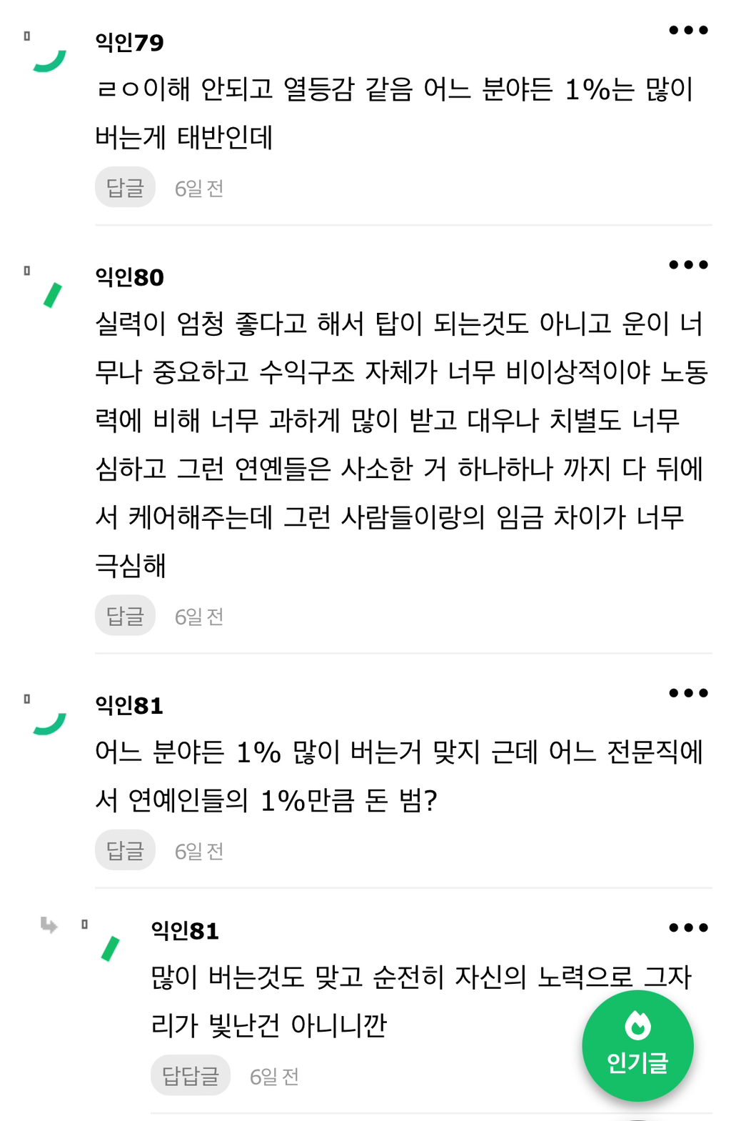 작성자시...뱅아 작성시간 25.01.16 노력대비 많이버는건 맞는거같음 엄청 어린나이에도 성공해서 많이 버니까?? 대부분은 그 연예인 하나를 위하 일하는 다른 주변인에 본인 투영을 더 많이하게되겟지...