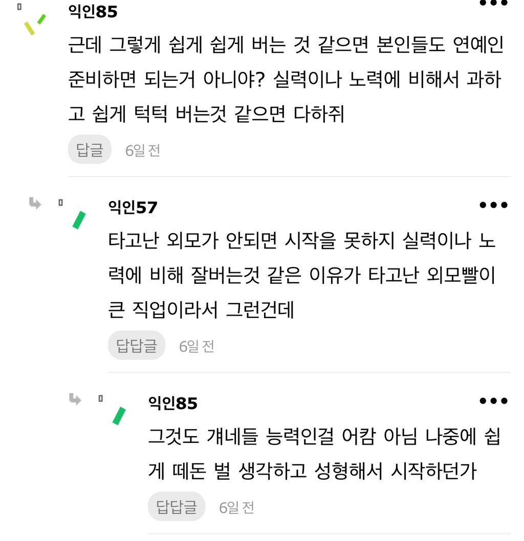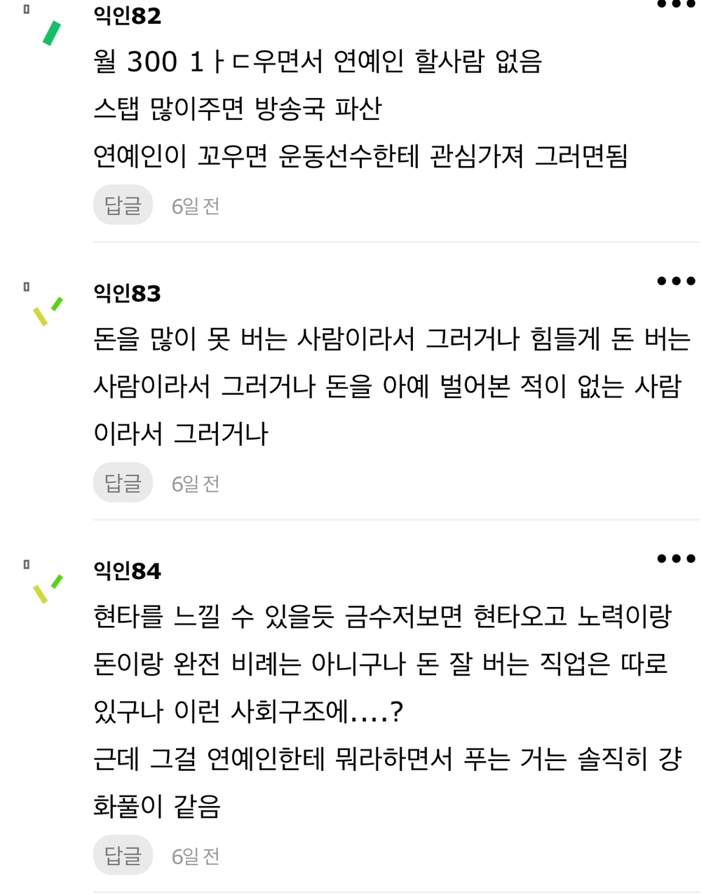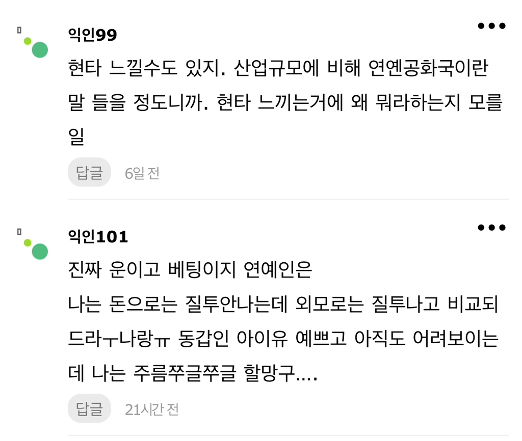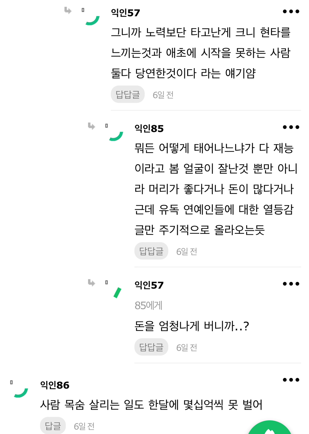 작성자시...뱅아 작성시간 25.01.16 노력대비 많이버는건 맞는거같음 엄청 어린나이에도 성공해서 많이 버니까?? 대부분은 그 연예인 하나를 위하 일하는 다른 주변인에 본인 투영을 더 많이하게되겟지...