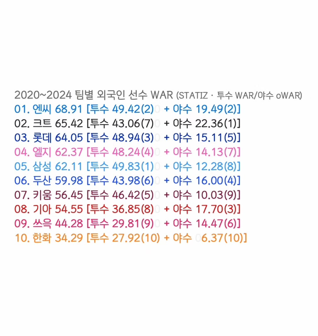 [흥미돋][야구] 최근 5시즌 용병 WAR 총합 순위 작성자죄송합니다겠냐고|작성시간25.01.15|조회수3,547 목록 댓글 27 글자크기 작게가 글자크기 크게가 출처: https://www.instagram.com/share/BAfGM9HDmY2020~2024년 스탯티즈 기준 다음검색 현재 게시글 추가 기능 열기 북마크 공유하기 신고 센터로 신고 댓글 댓글 27 댓글쓰기 답글쓰기 댓글 리스트 작성자위즈 | 작성시간 25.01.15 올해도 맡겨놨다 작성자슈퍼왕왕이 | 작성시간 25.01.15 한화야,, 작성자도니(살) | 작성시간 25.01.15 네일이님이 오기 전까지 투수용병은 없는거나 마찬가지였지 작성자한화이글스우승한다 | 작성시간 25.01.15 한화이글스 일등 뒤에서 작성자찹쌀도나쓰으 | 작성시간 25.01.15 한화스카우터도 어찌보면 실력있는거임어쩜...어쩜....저런걸 잘 찾아내지?오그레디였나 그 시발것... 걔랑 스미슨지 뭔지 걔도... 하 시발 열받네 댓글 전체보기