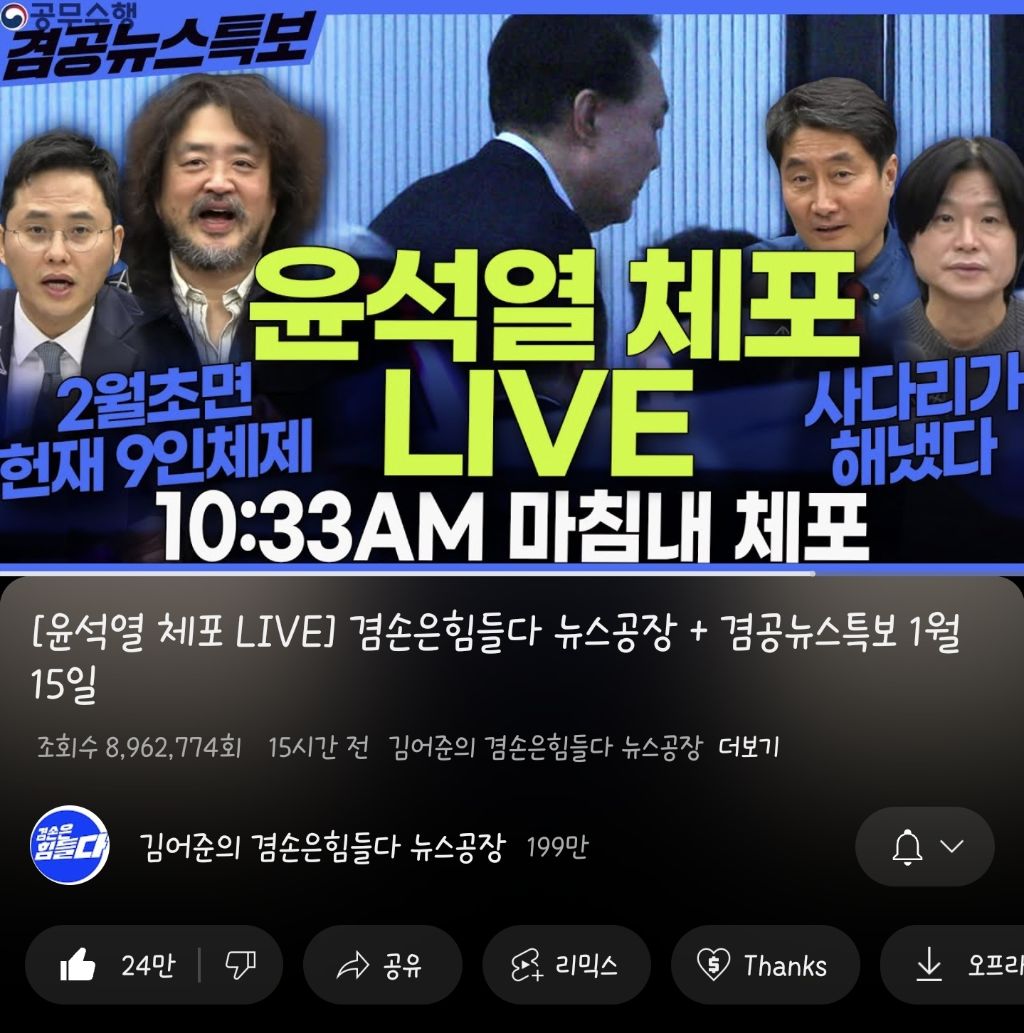 [흥미돋]곧 1000만 찍을 거 같은 뉴스공장 윤석열 체포 라이브 방송 작성자NewJeans!|작성시간25.01.15|조회수10,239 목록 댓글 43 글자크기 작게가 글자크기 크게가 출처: https://www.youtube.com/live/oD_d0a0HOZU?si=eG2oNfWBrP3-qMbb[윤석열 체포 LIVE] 겸손은힘들다 뉴스공장 + 겸공뉴스특보 1월 15일#김어준 #겸손은힘들다 #뉴스공장 #명랑사회 #홍사훈 #이재석 #주진우 #김창규 #공지혜 #한남동실시간 #관저앞 #윤석열체포◎ [겸손브리핑]▷ 안귀령 / 앵커[잠깐만 인터뷰] - 전화연결12.3 내란 당www.youtube.com지금도 계속 오르는 중..ㅋㅋㅋㅋㅋㅋㅋ실시간으로 못 본 직장인들이 퇴근하면서 많이들 보나봄ㅋㅋ 다음검색 현재 게시글 추가 기능 열기 북마크 공유하기 신고 센터로 신고 댓글 댓글 43 댓글쓰기 답글쓰기 댓글 리스트 작성자버섯핑 | 작성시간 25.01.15 나 지금 마저 볼라구 ㅎㅎ 작성자Cillianmurphy | 작성시간 25.01.15 와 대박이넼ㅋㅋㅋㅋㅋ아침에생방봤는뎈ㅋㅋㅋ 작성자딸기라떼먹고싶은언니 | 작성시간 25.01.16 비공개.. 답댓글 작성자NewJeans! 작성자 본인 여부 작성자 | 작성시간 25.01.16 헐 비공개됨? 왜지 답댓글 작성자딸기라떼먹고싶은언니 | 작성시간 25.01.16 NewJeans! 아까비공개됐는데다시공개로됐네ㅣ;뭐지ㅜㅜ 댓글 전체보기