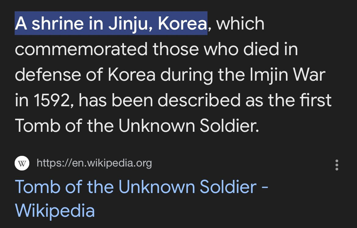 한국 진주에 있는 무명 용사의 기념비가 세계 최초라고 한다.