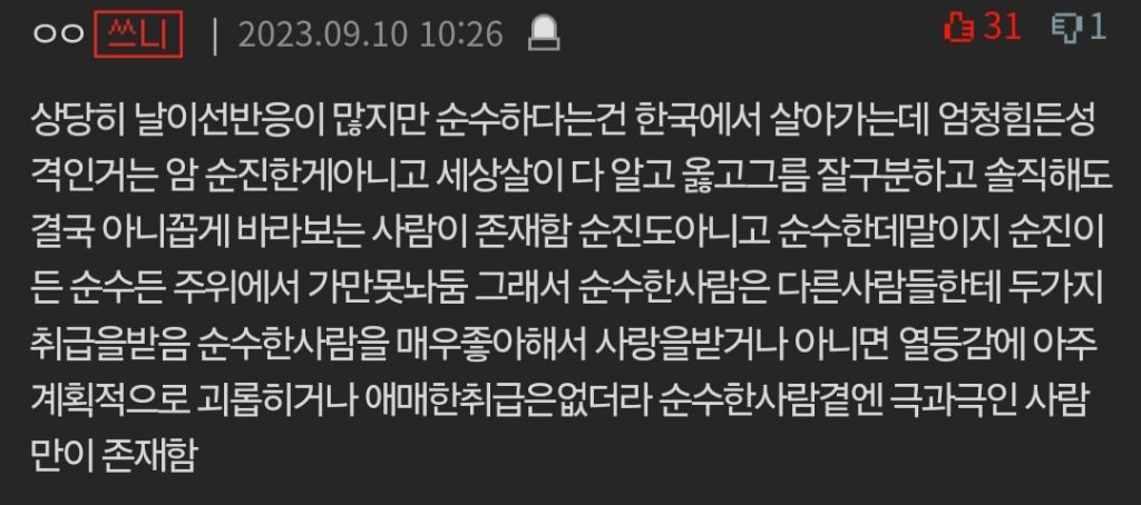 작성자겨울이라니까요 작성시간 25.01.19 나이먹고 순수한건 멍청한거 아냐? 나 그런 분 봤는데 답답해 뒤지는줄. 40대인데 너무 순수해서 자기 할 일 조차 제대로 못함. 사회 쓴 맛을 본 적 없는 가정주부라서 진짜 순수한데 답답함